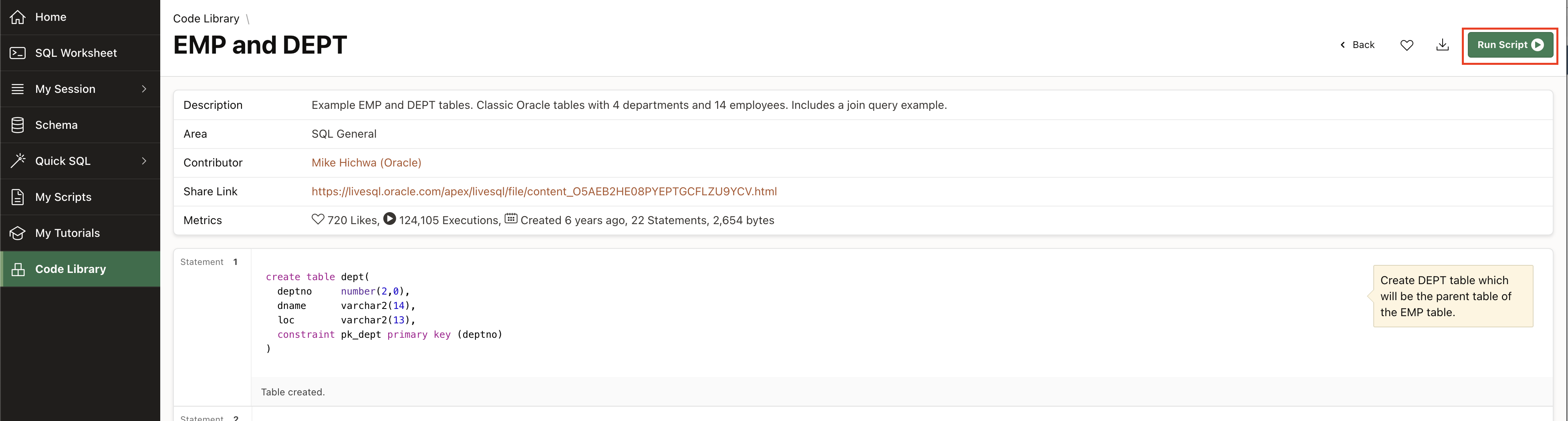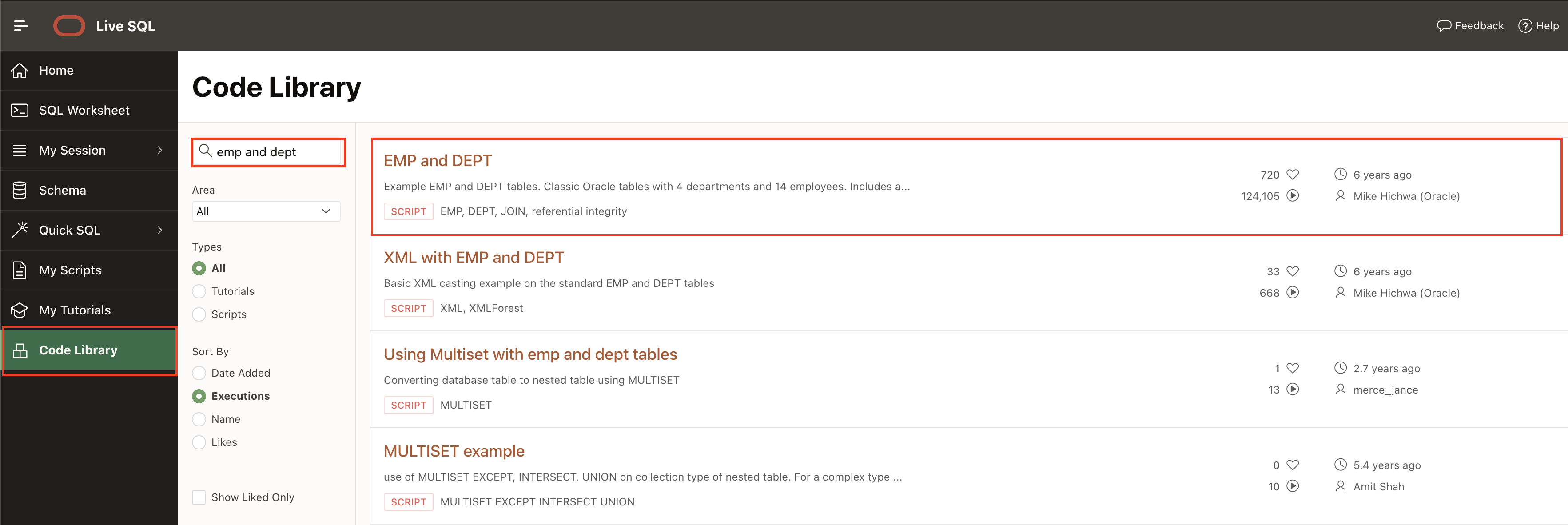 2. Code Library 메뉴에서 emp and dept 검색 후 클릭