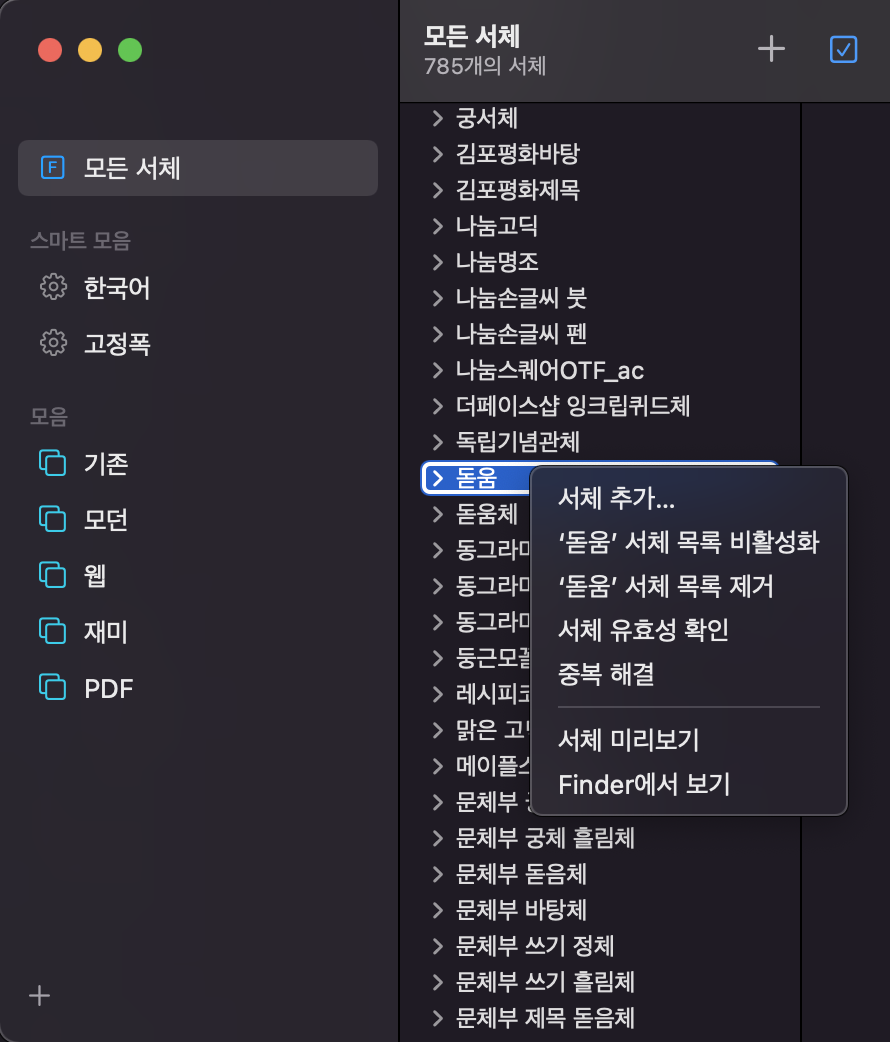 나는 이게 싫어서 사용자 서체에 있는 폰트를 시스템 서체 폴더로 모두 이동시켰다.
