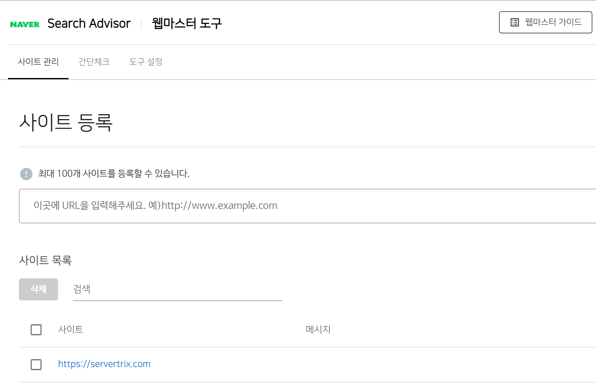 1. 네이버 서치어드바이저에 접속하고 사이트 등록에 도메인을 입력한다.