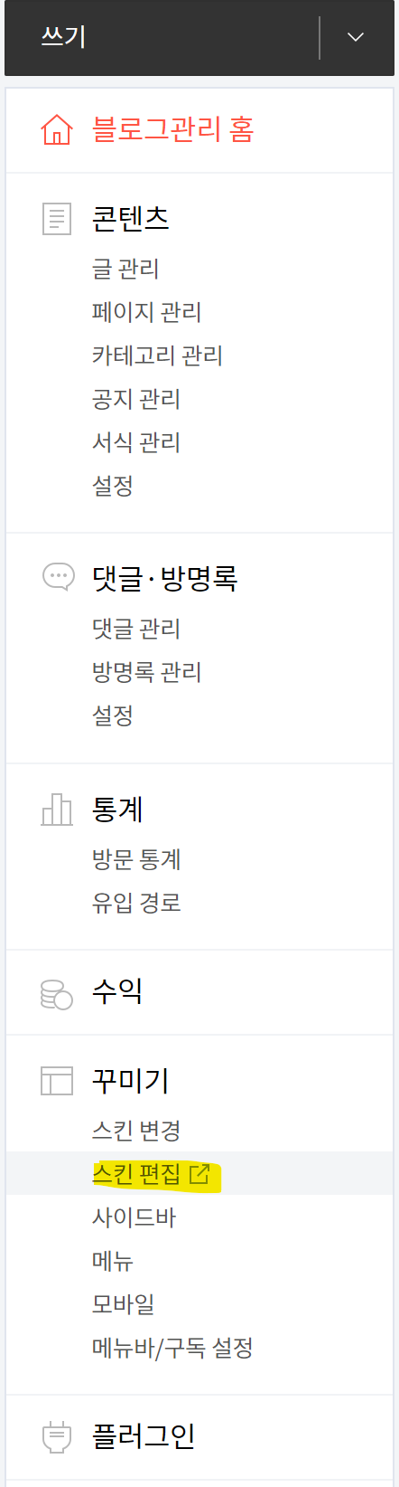 3. 블로그관리 홈 > 꾸미기 > 스킨 편집 메뉴로 들어간다