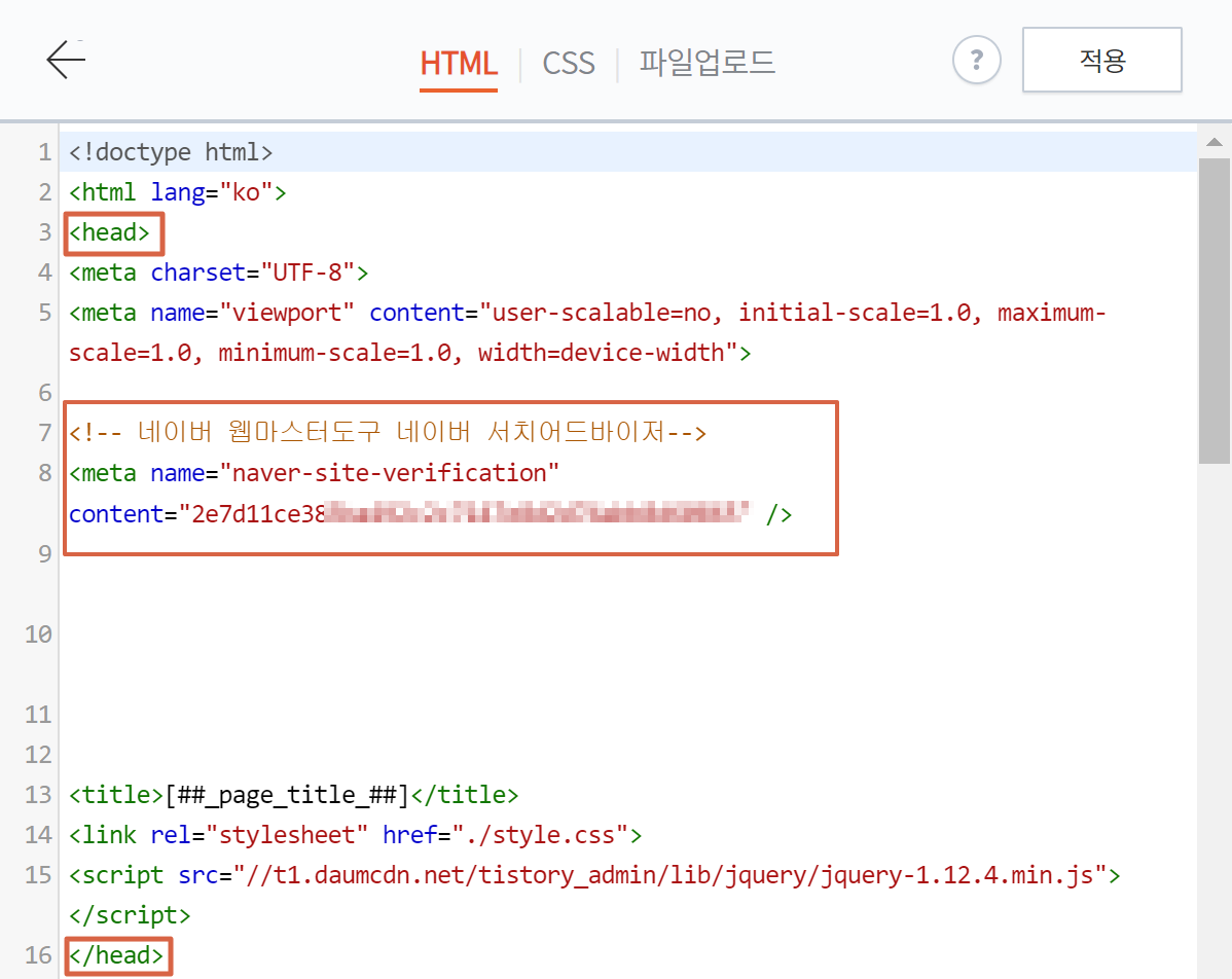 5. <head> 와 </head> 사이에 복사한 메타태그를 붙여넣기하고 적용