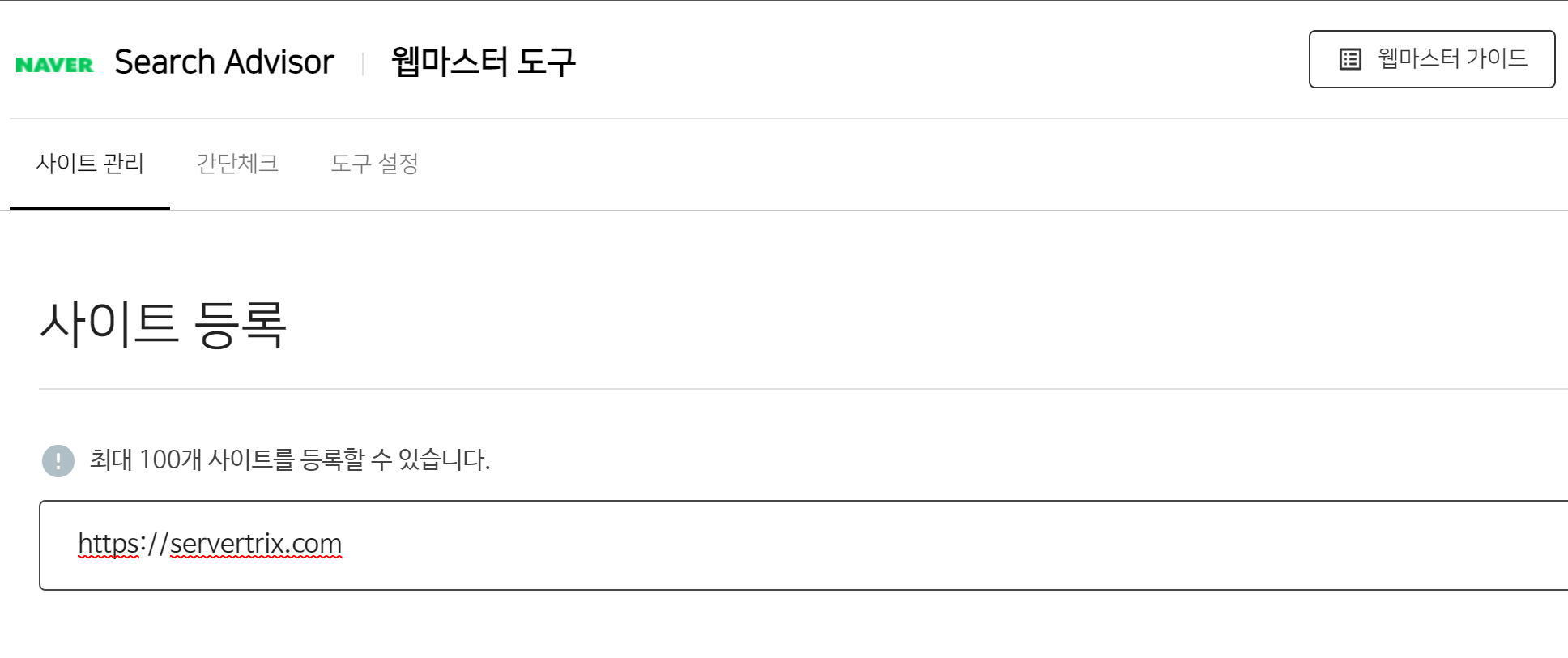 1. 네이버 서치어드바이저에 접속하고 사이트 등록에 도메인을 입력한다.