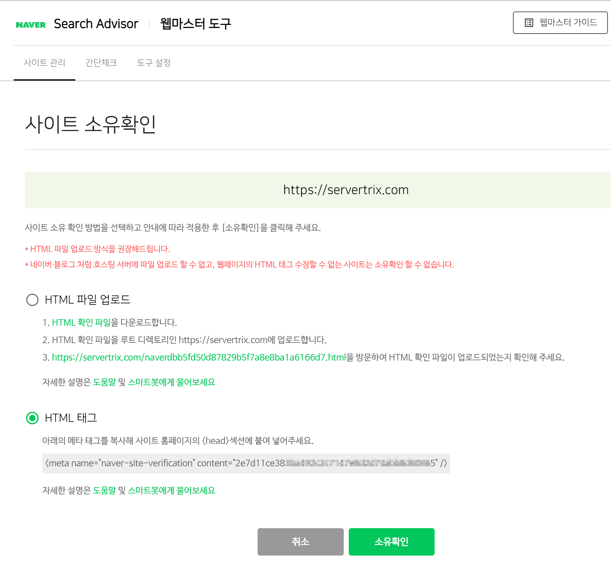 6. 다시 네이버 서치어드바이저로 돌아와서 HTML 소유확인을 누르고 완료!