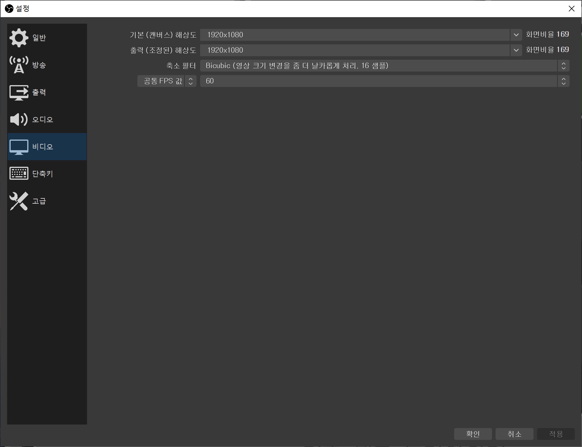 비디오 탭에서 영상의 해상도 및 FPS를 설정하자