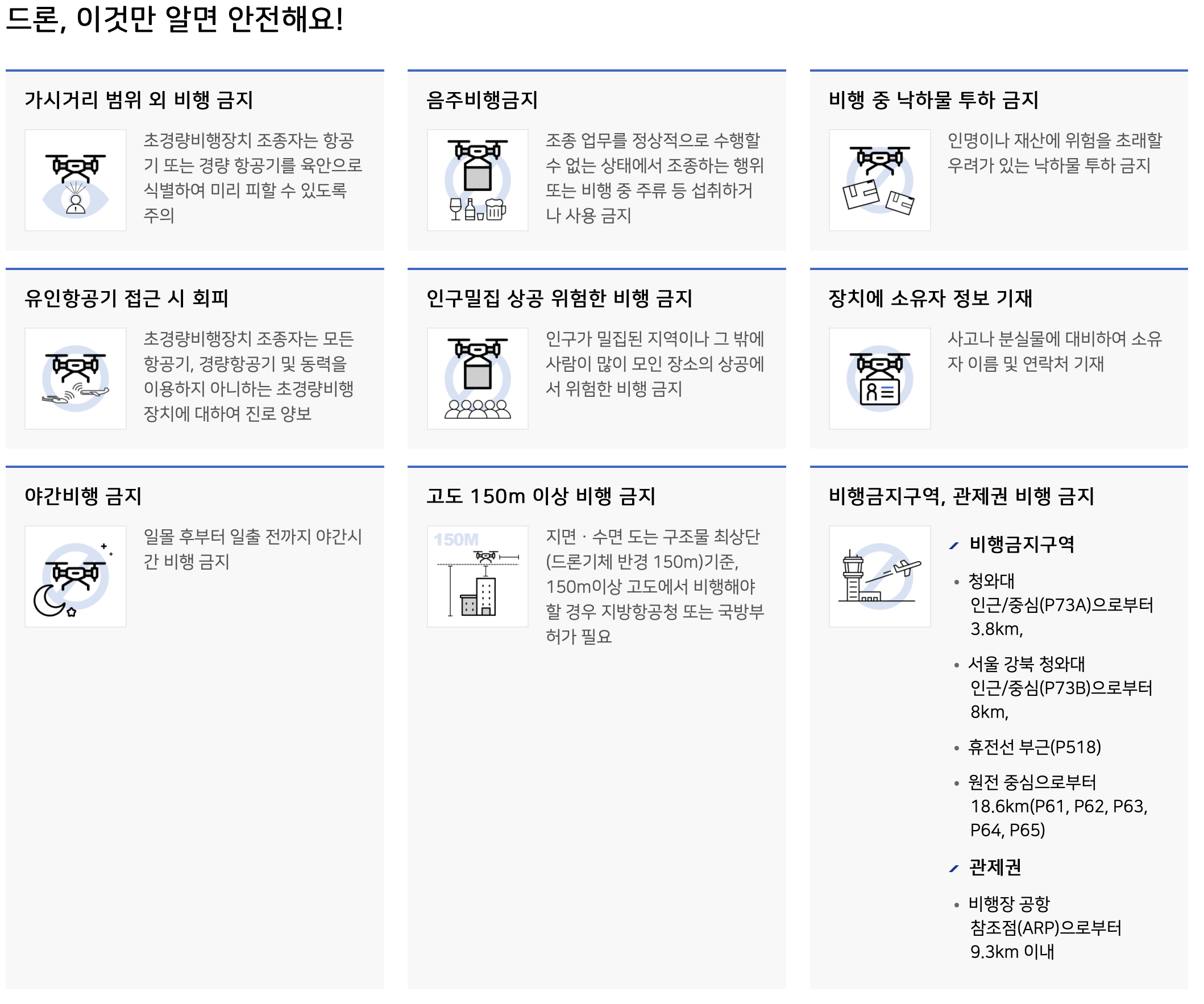 - 관제권, 비행금지구역이 아닌 곳에서 무인비행기, 무인헬리콥터 또는 무인멀티콥터 중 최대이륙중량이 25kg 이하이고 최저비행고도(150m) 미만 고도에서 비행하는 경우 비행승인 대상에서 제외