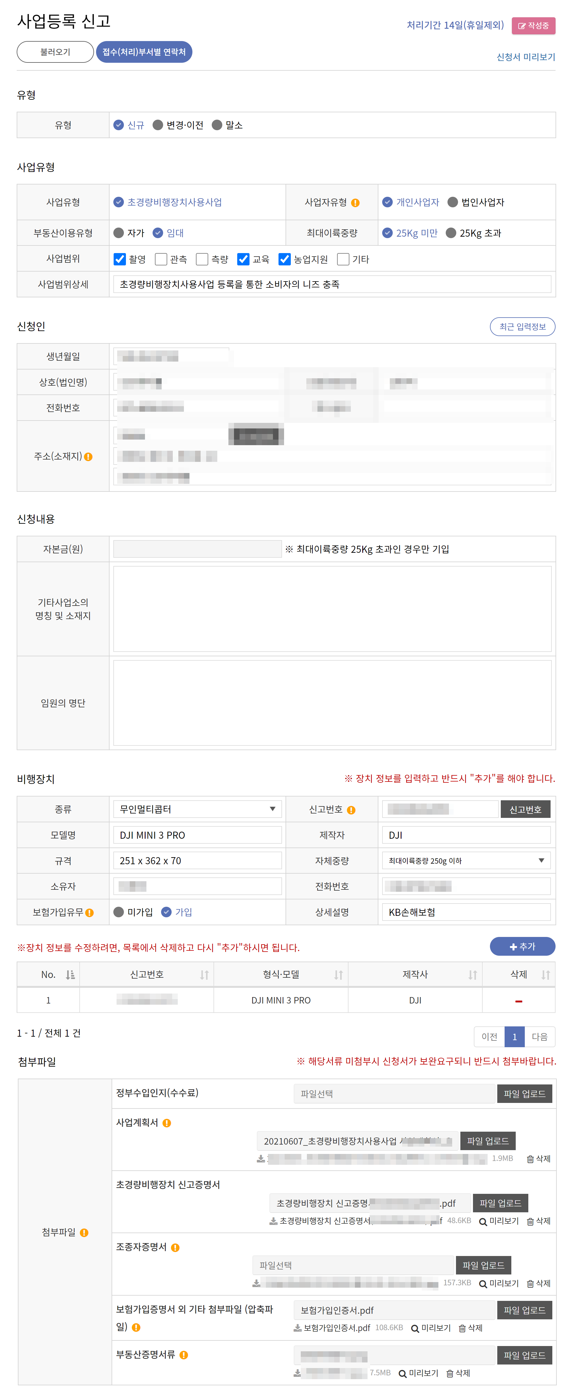 비행장치 신고 접수 완료 (비행장치 신고 완료 후 발급된 신고번호를 가지고 사업등록 신고)