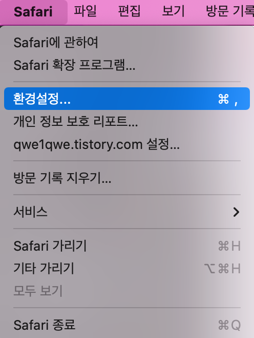1. 사파리 > 환경설정 메뉴에 들어가서