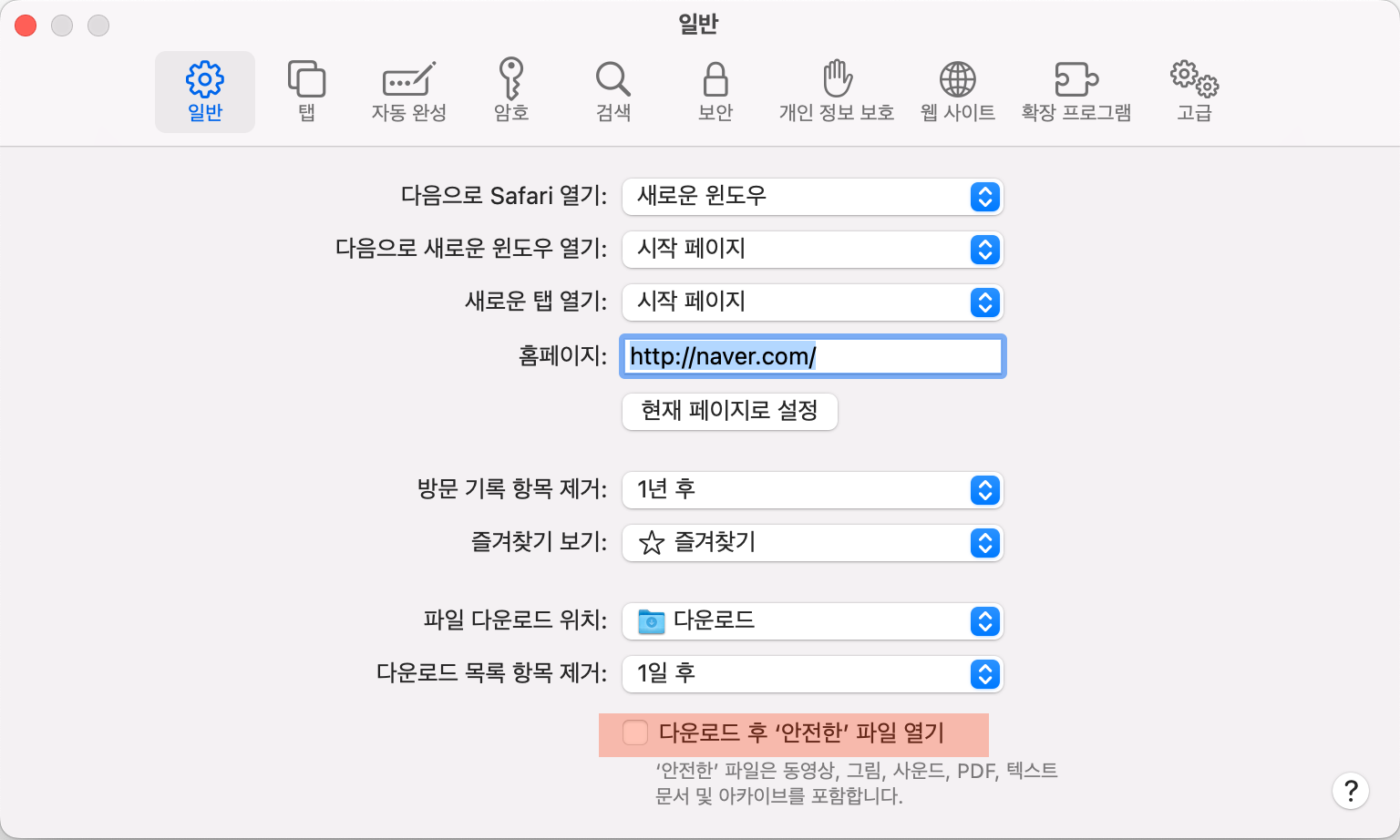 2. 일반 > 다운로드 후 '안전한' 파일 열기를 해제해주면 간단히 해결된다