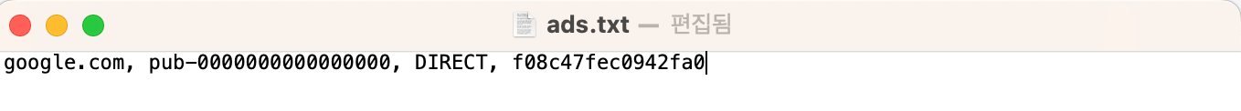 google.com, pub-0000000000000000, DIRECT, f08c47fec0942fa0 이런 형태로 문자열을 만들라고 하니까