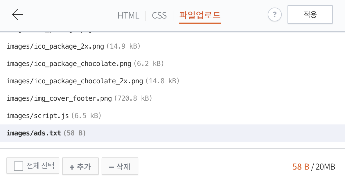 파일업로드 > 추가 > ads.txt 파일 업로드 > 적용 클릭