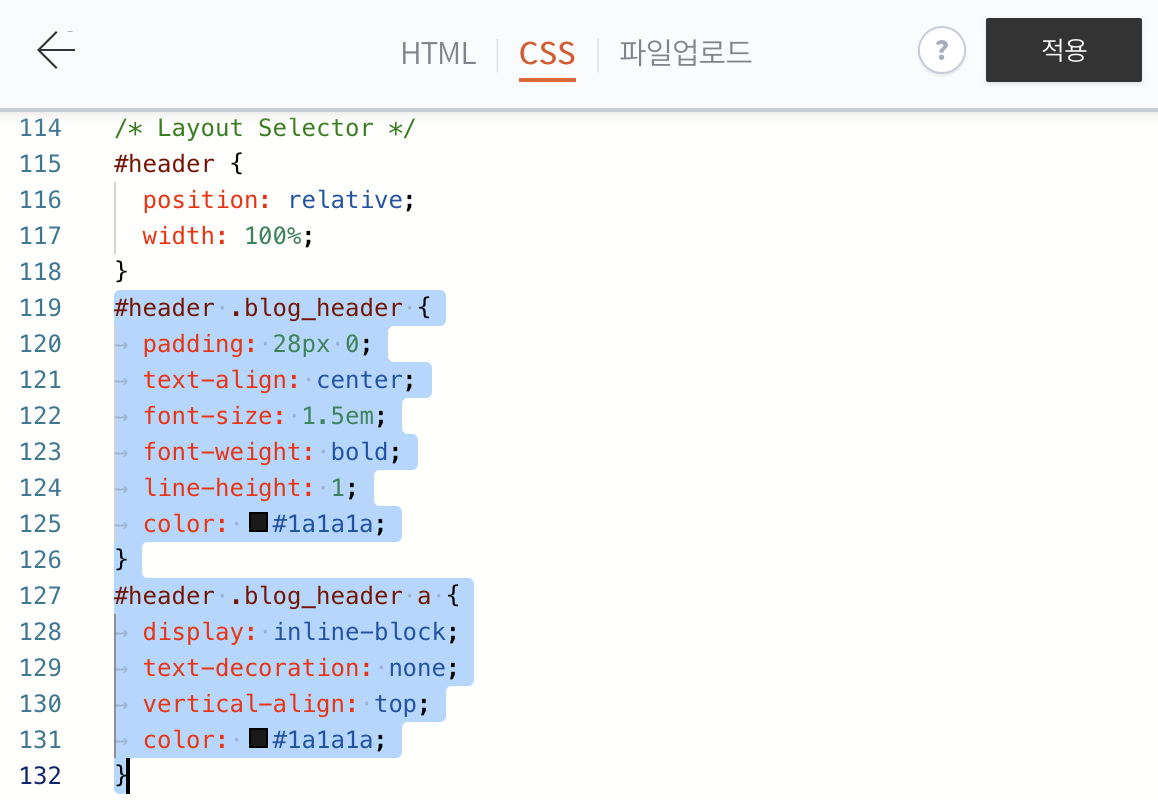 html에 div태그로 blog_header라고 설정을 했기 때문에 css에 이를 적용해준다