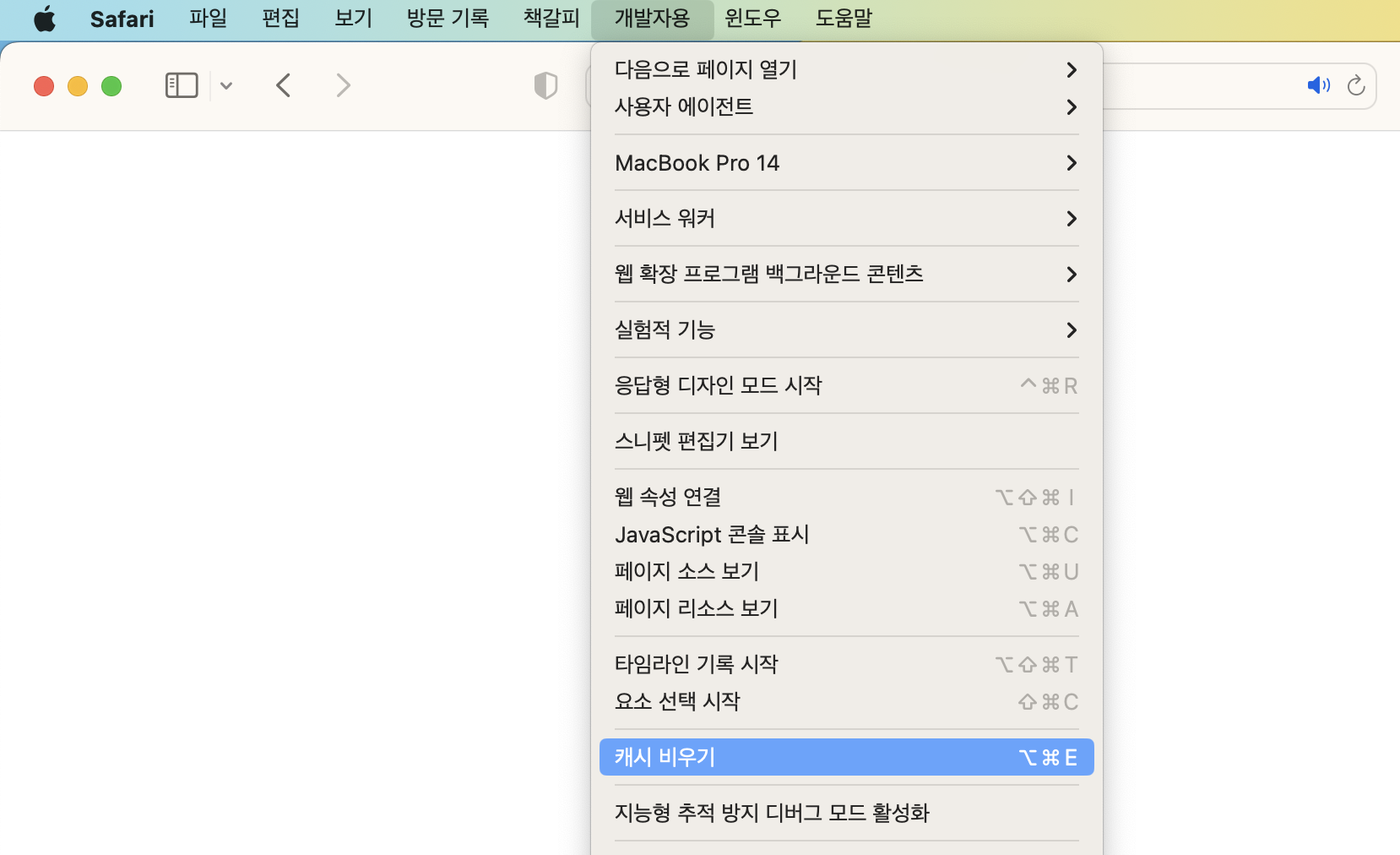4. ‘개발자용’ 메뉴에서 ‘캐시 비우기’를 선택하거나 ⌥ Option + ⌘ Command + E를 누른다.