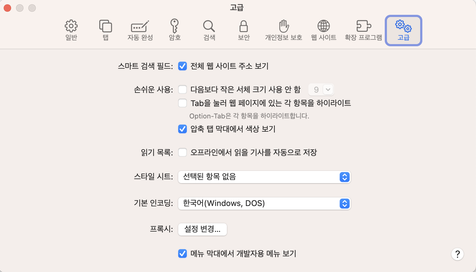 3. 고급탭에서 "메뉴 막대에서 개발자용 메뉴 보기"를 선택한다