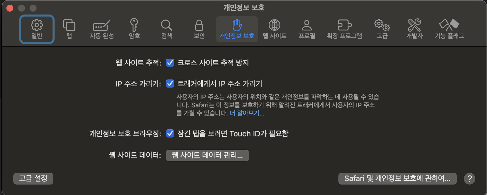 "사파리 > 설정 > 개인정보 보호" 탭