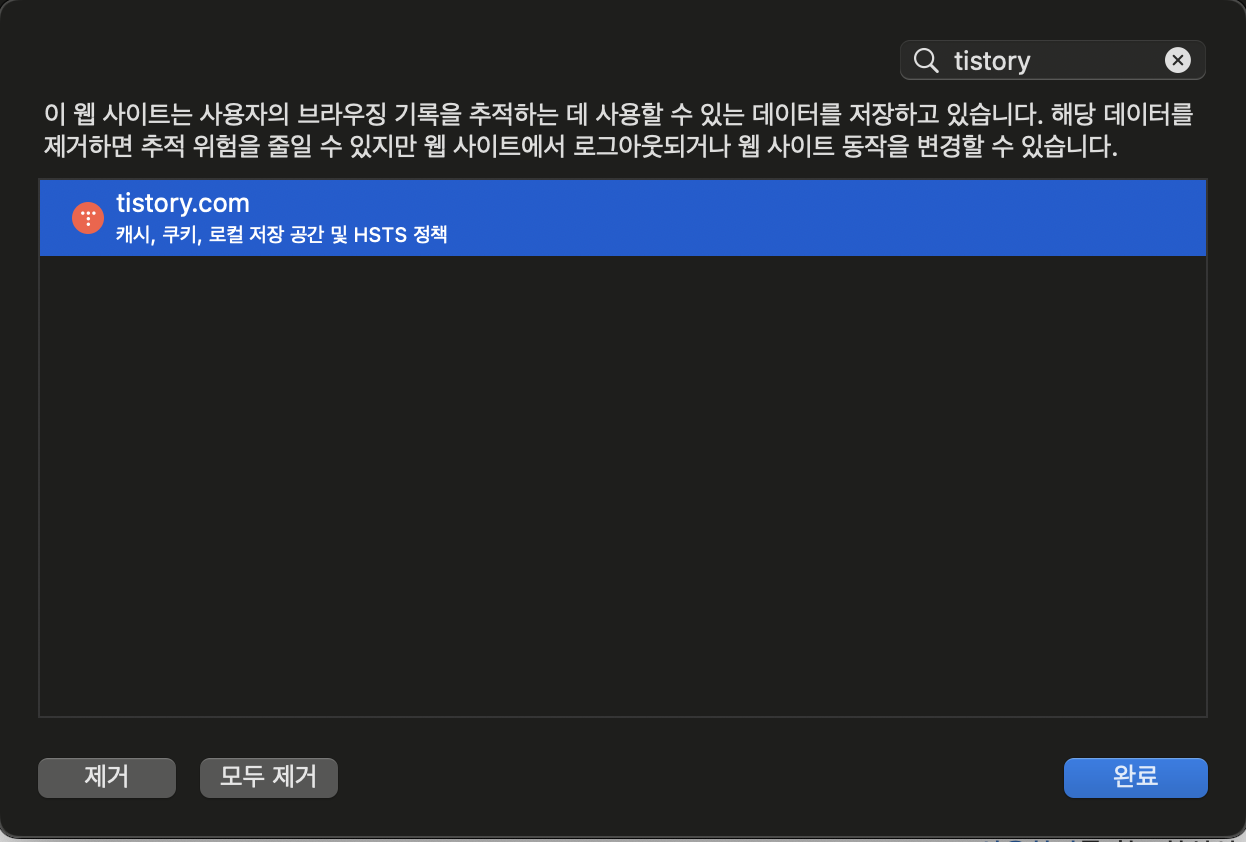 tistory.com을 선택하고 "제거"를 눌러주고