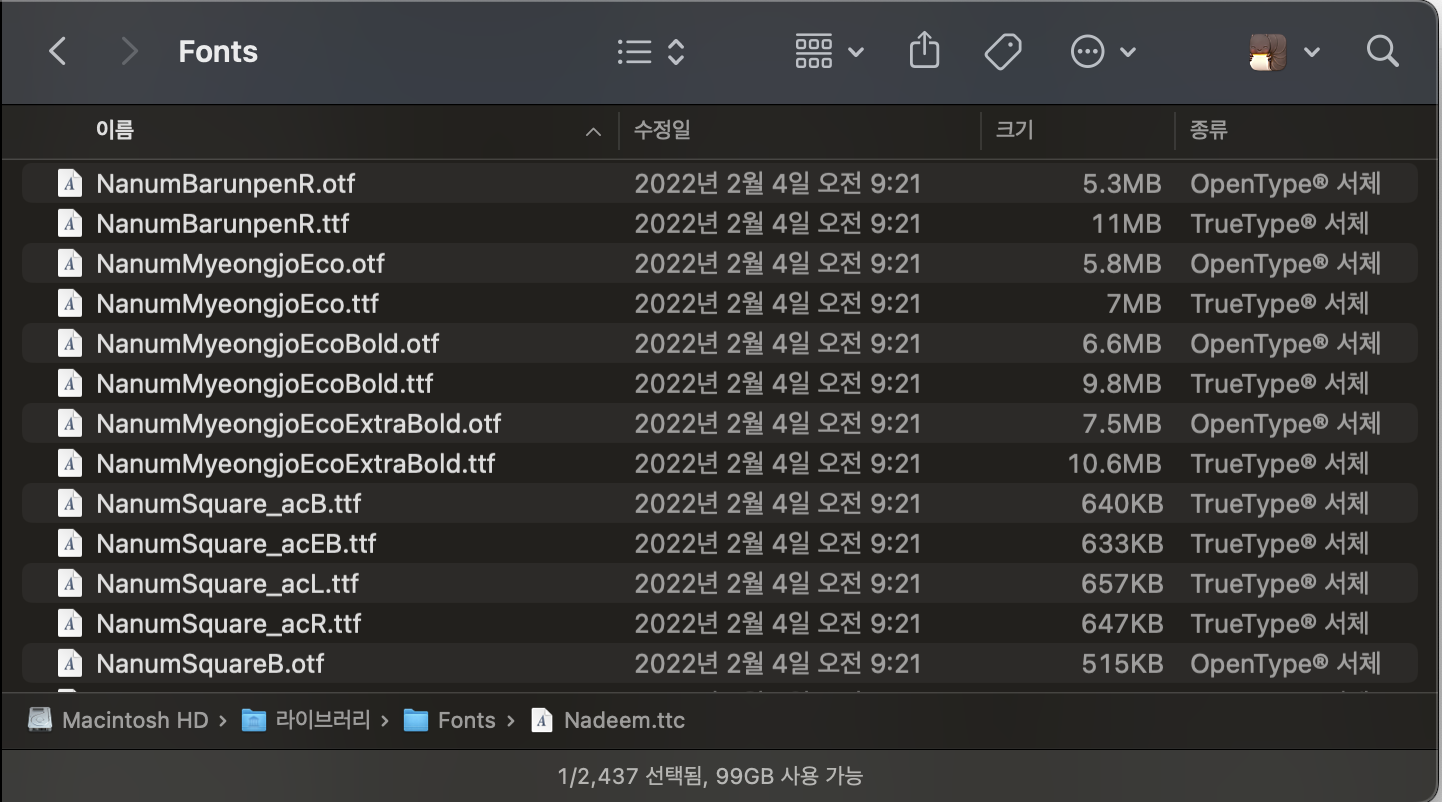 파인더 > Macintosh HD > 라이브러리 > Font 폴더로 이동하면 된다