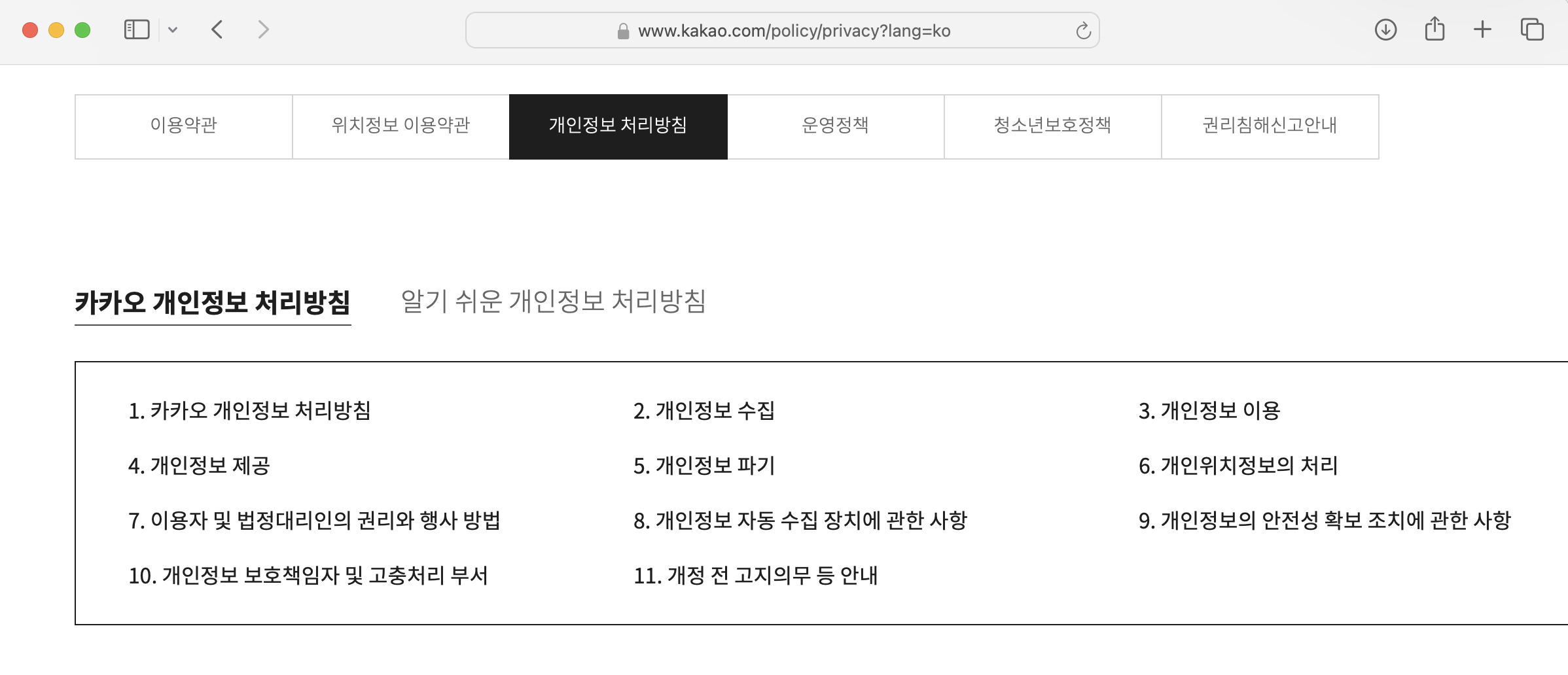 개인정보 처리방침에 대한 내용이 아주 상세히 나온다