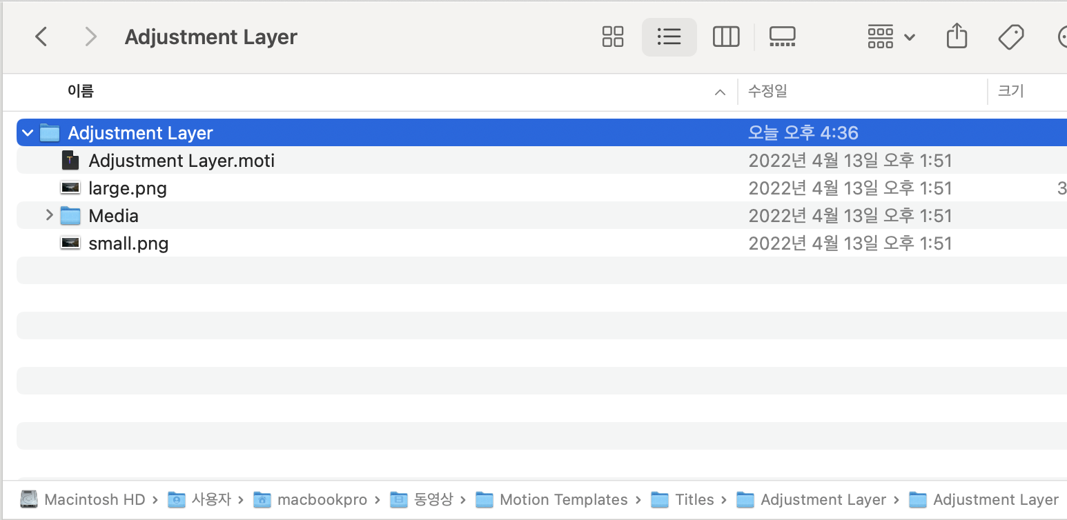 압축이 제대로 풀어졌다면 파이널컷 타이틀 밑에 Adjustment Layer를 볼 수 있다