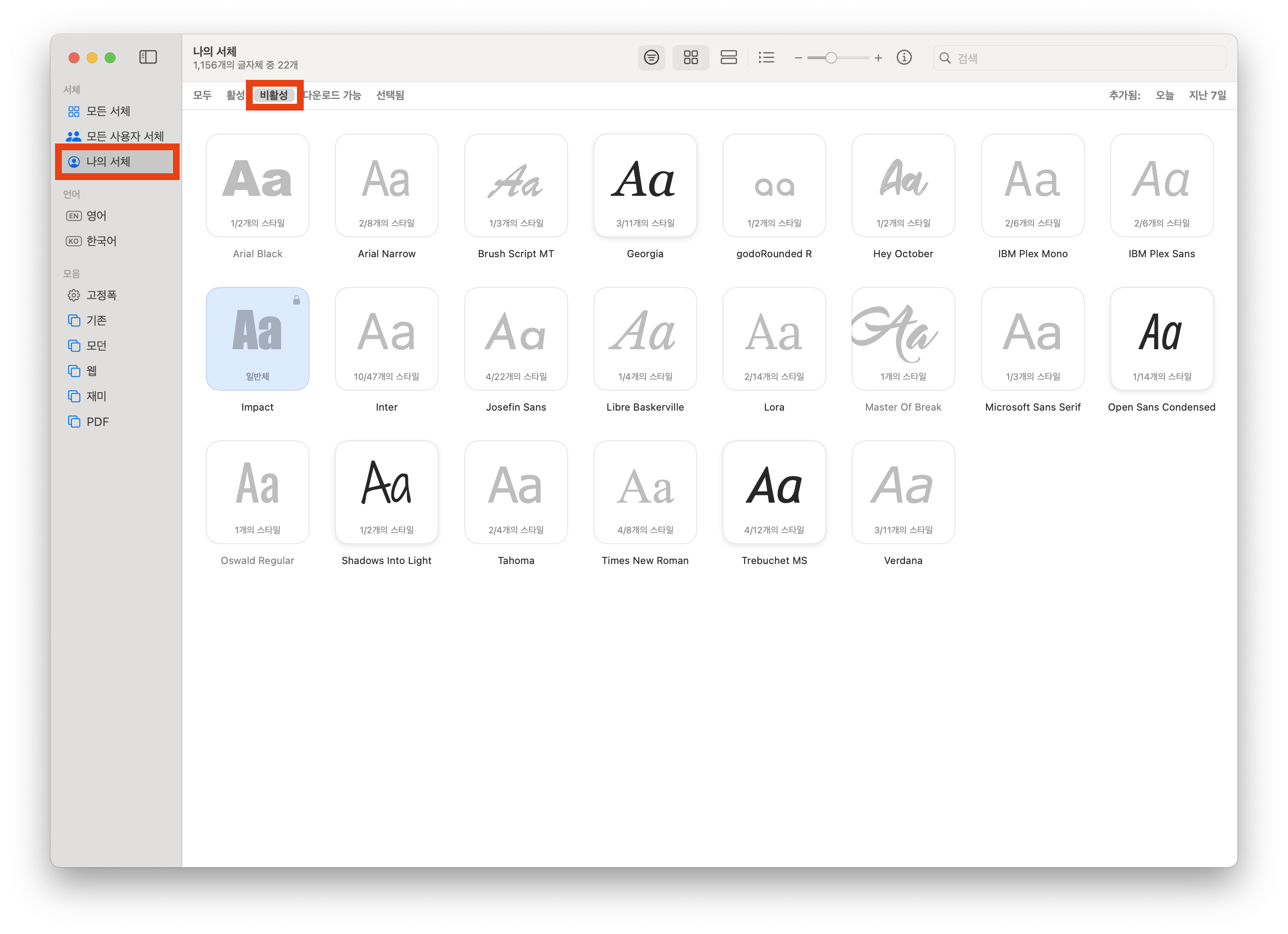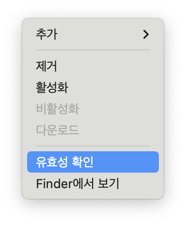 서체 관리자 > 나의 서체 > 비활성 메뉴에서 폰트를 우클릭하면 유효성 확인과 Finder에서 보기를 통해 경로를 찾을 수 있고