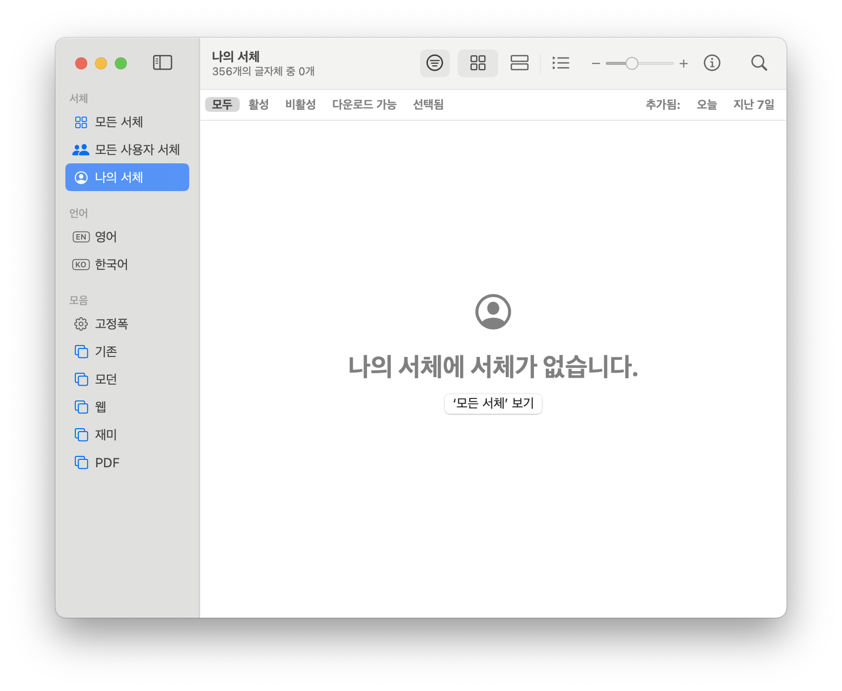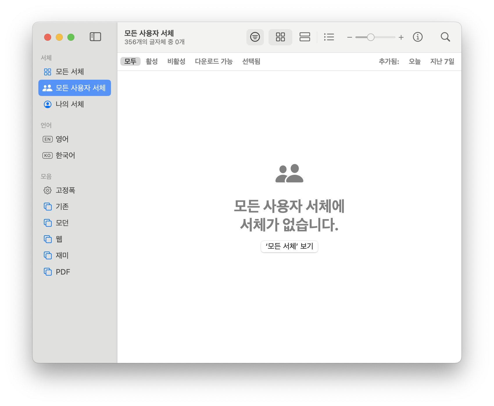 서체 관리자에서도 동일하게 서체가 없다고 나온다. 즉 초기화가 되었다고 보면 됨