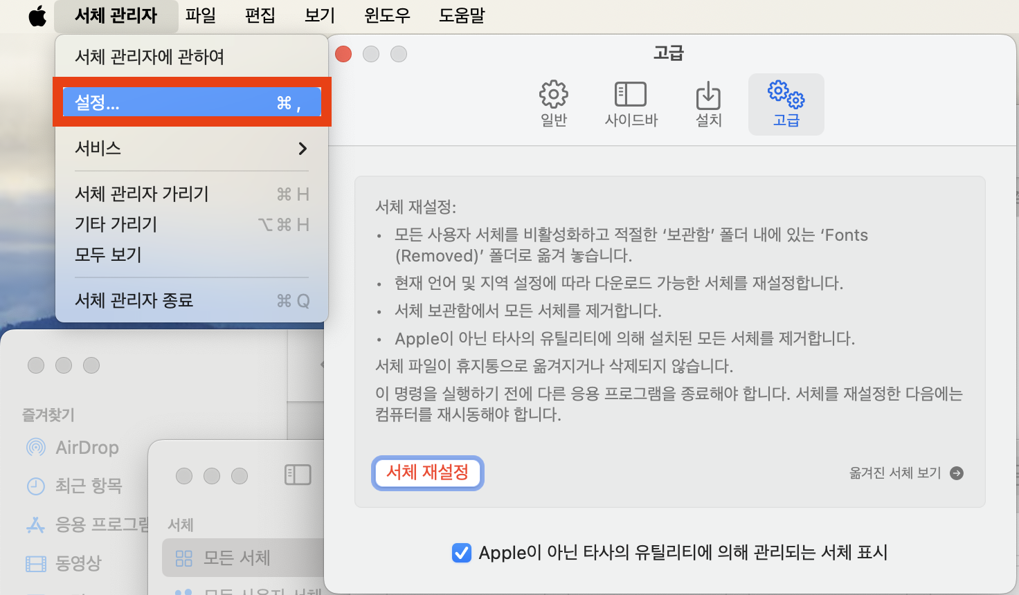 정리가 필요한 듯 하니 기존 폰트를 백업해 놓고 [서체 재설정] 을 해보자