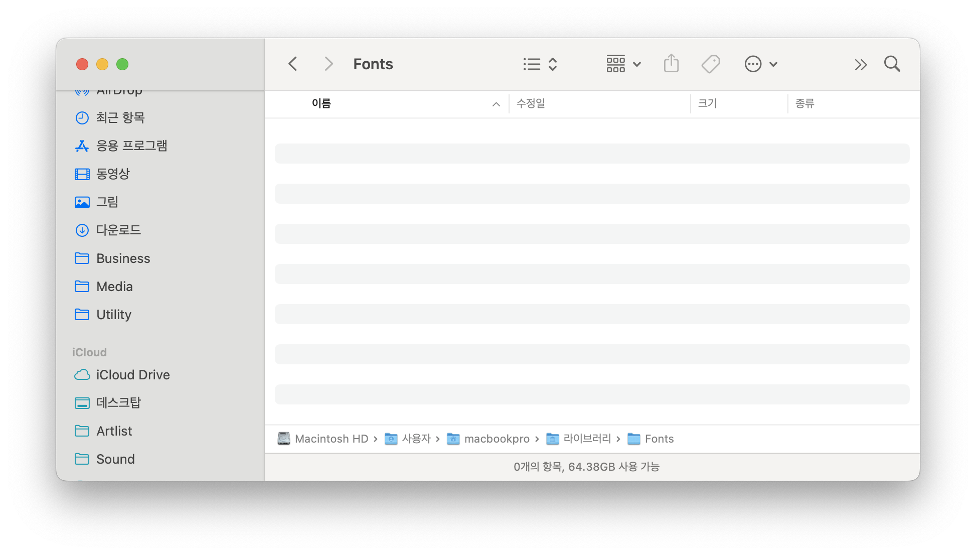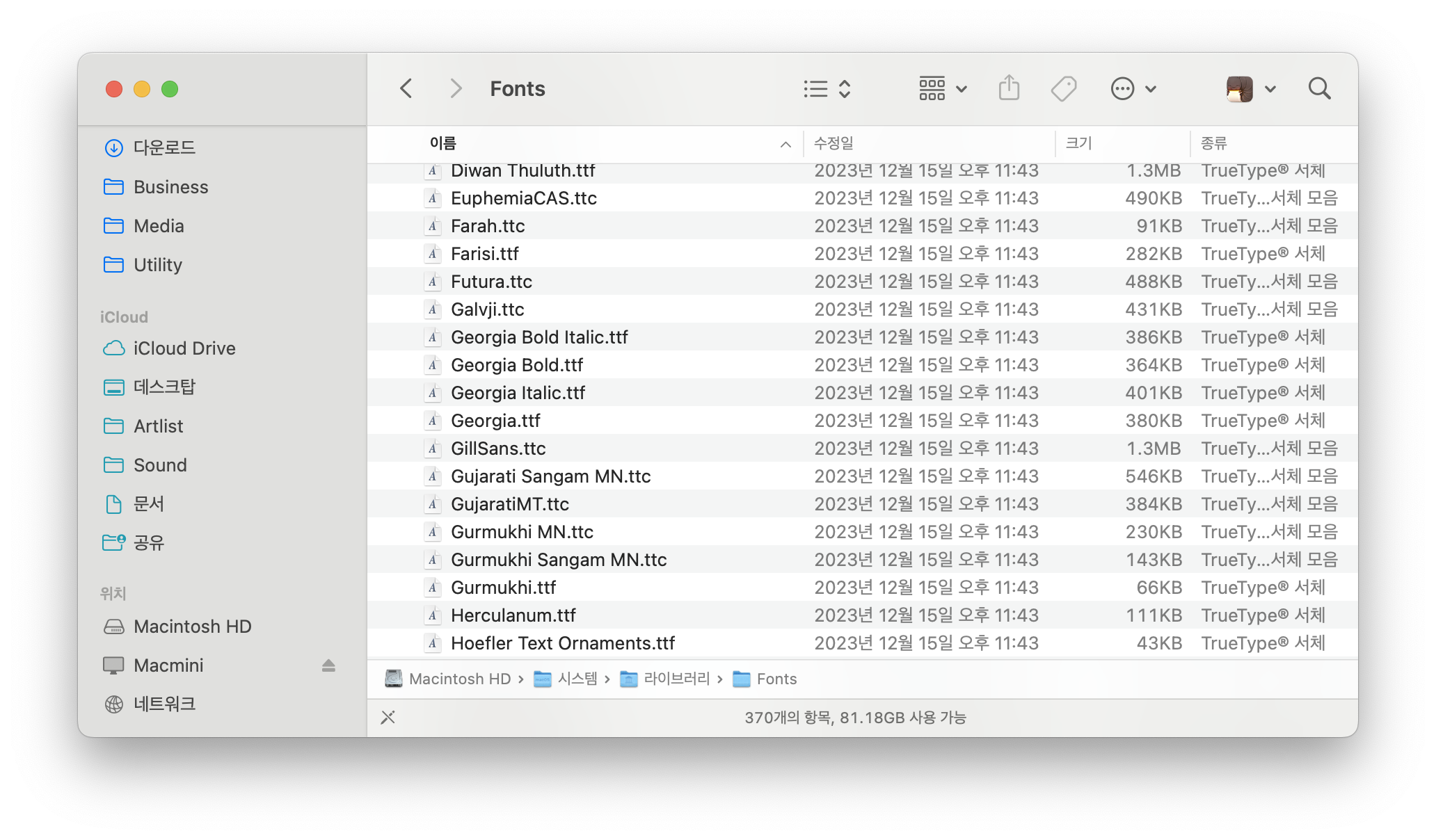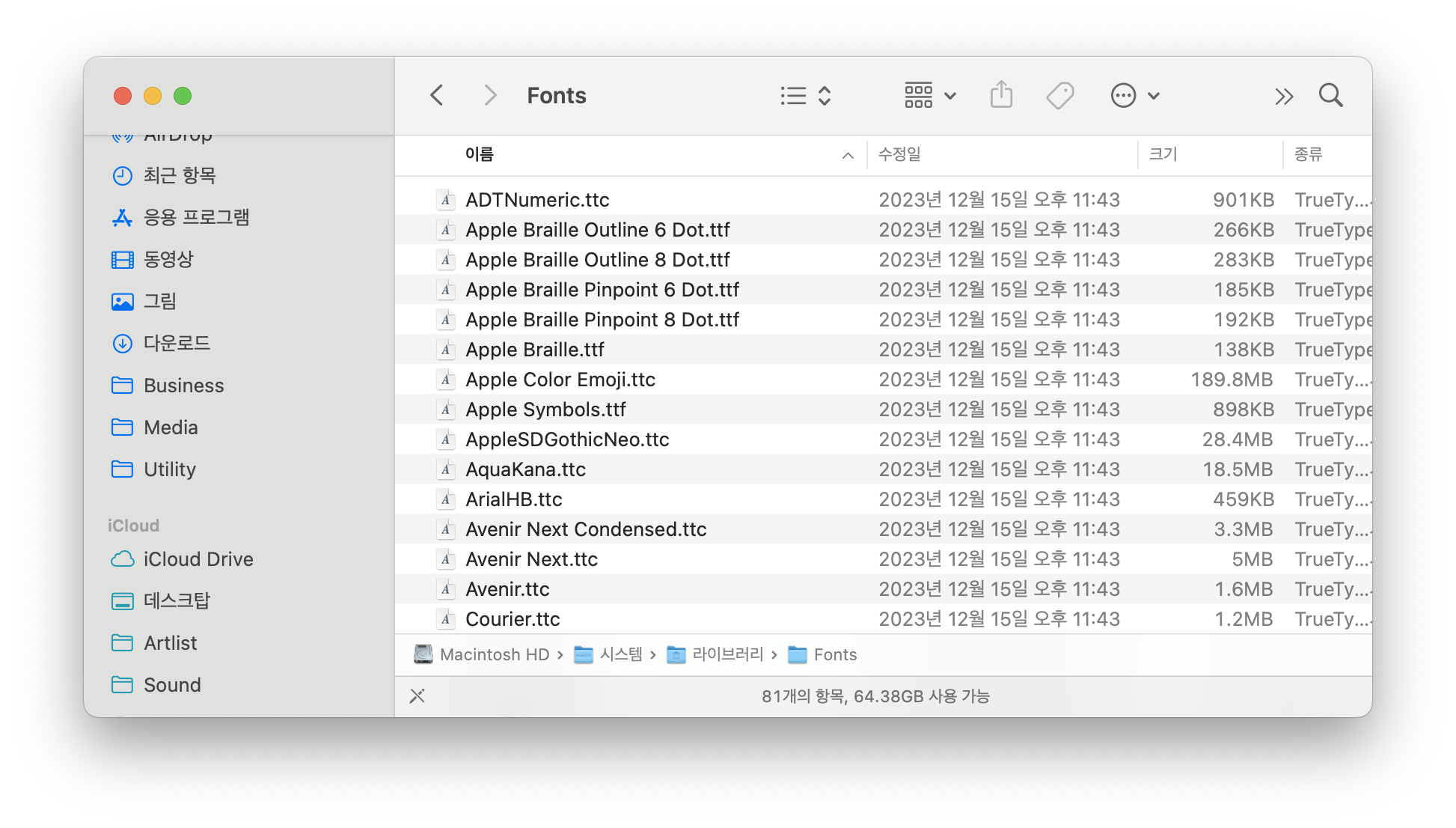 그런더 폰트 경로를 찾다보니 시스템/라이브러리/Fonts 폴더도 있다