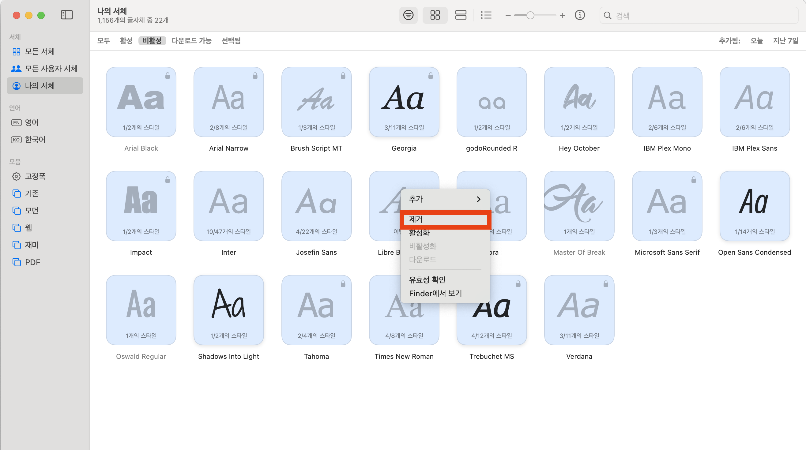 미련없이 나의 서체 메뉴에서 제거를 눌러줬다