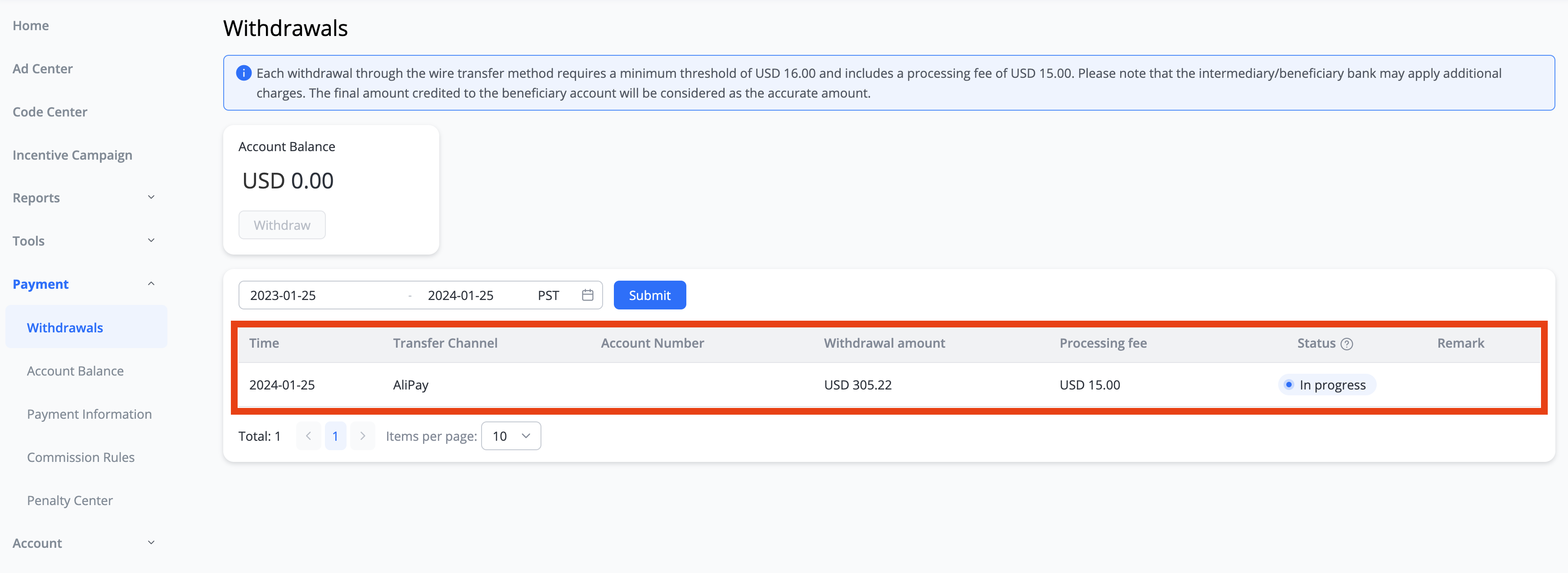 Payment > Withdrawls 메뉴로 이동이 되는데