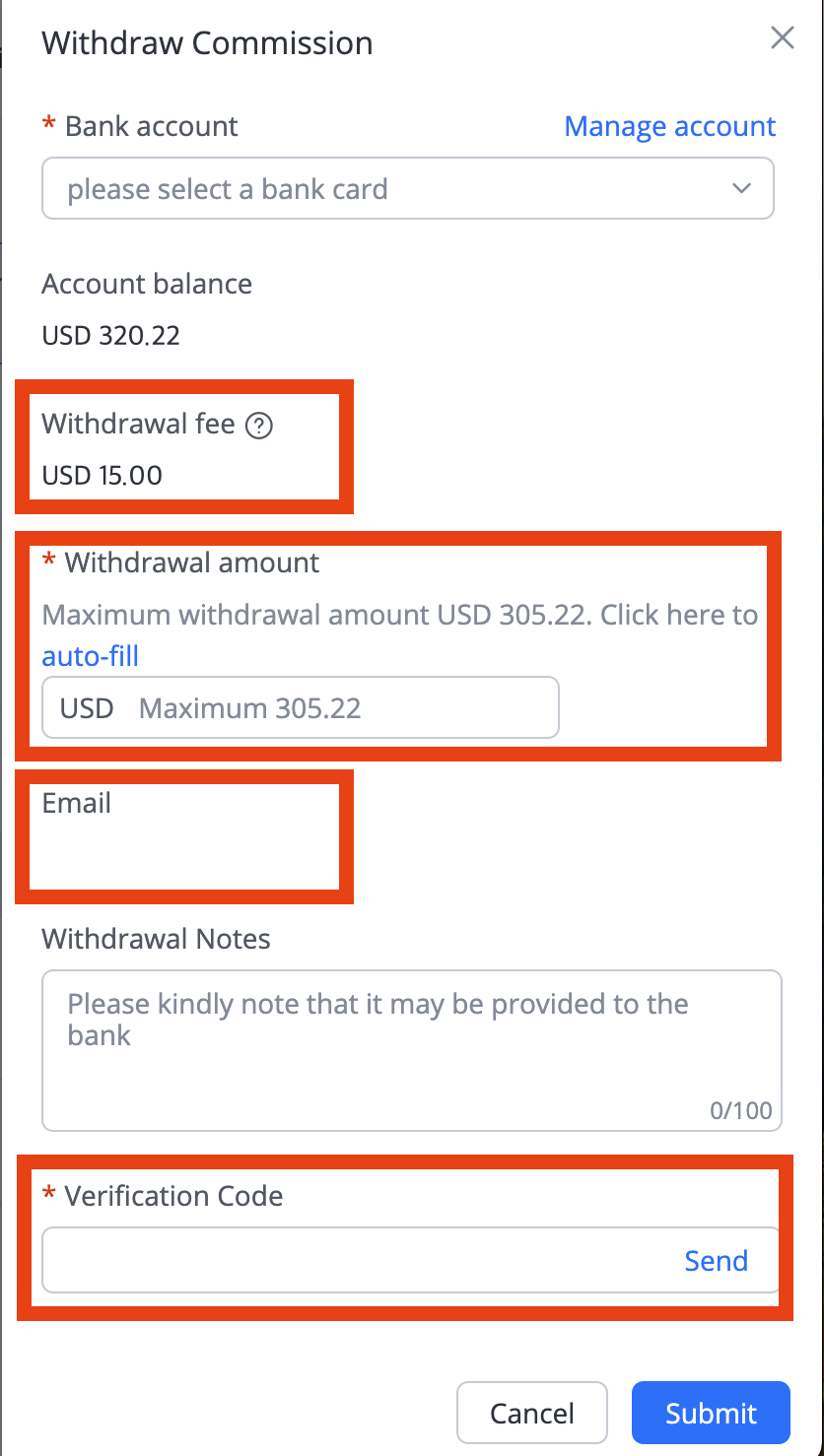 Bank account는 등록해 두었던 계좌정보를 선택하면 되고