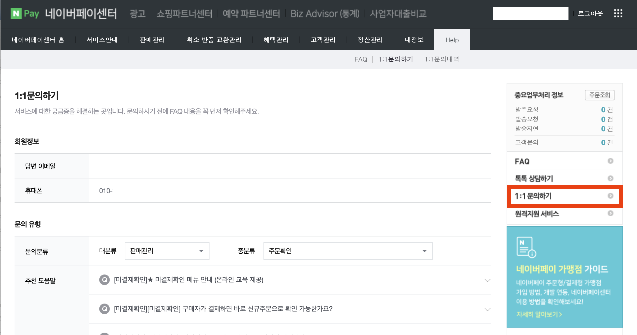 "네이버페이 주문형"의 알림은 네이버페이에서 1:1 문의로 남겨야 한다