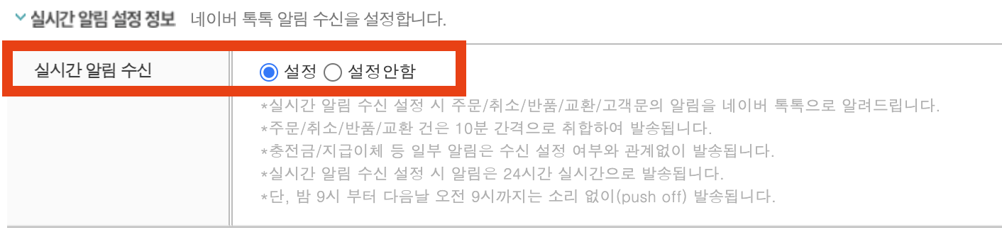| 실시간 알림 수신을 원하실 경우, 아래 메뉴를 통해 직접 신청 가능합니다. - [네이버페이센터 > 내정보 > 가입정보 변경] 메뉴 하단 실시간 알림 수신 '설정' 상태에서 '변경' 클릭 실시간 주문현황은 [관리자] 네이버 아이디로 네이버 톡톡 알림되며, 실시간 알림 수신 설정이 되면, 10분 간격 또는 실시간으로 알려드립니다. 고객 문의는 등록 즉시 실시간으로, 주문/취소/교환/반품 건은 10분 간격으로 취합하여 알려드립니다. 실시간 알림 예시) 09:00~09:10 발생된 주문의 경우, 취합하여 발송 처리 (알림 수신 이전 주문 상태가 변경되면, 실제 건수와 차이가 있을 수 있습니다.) |