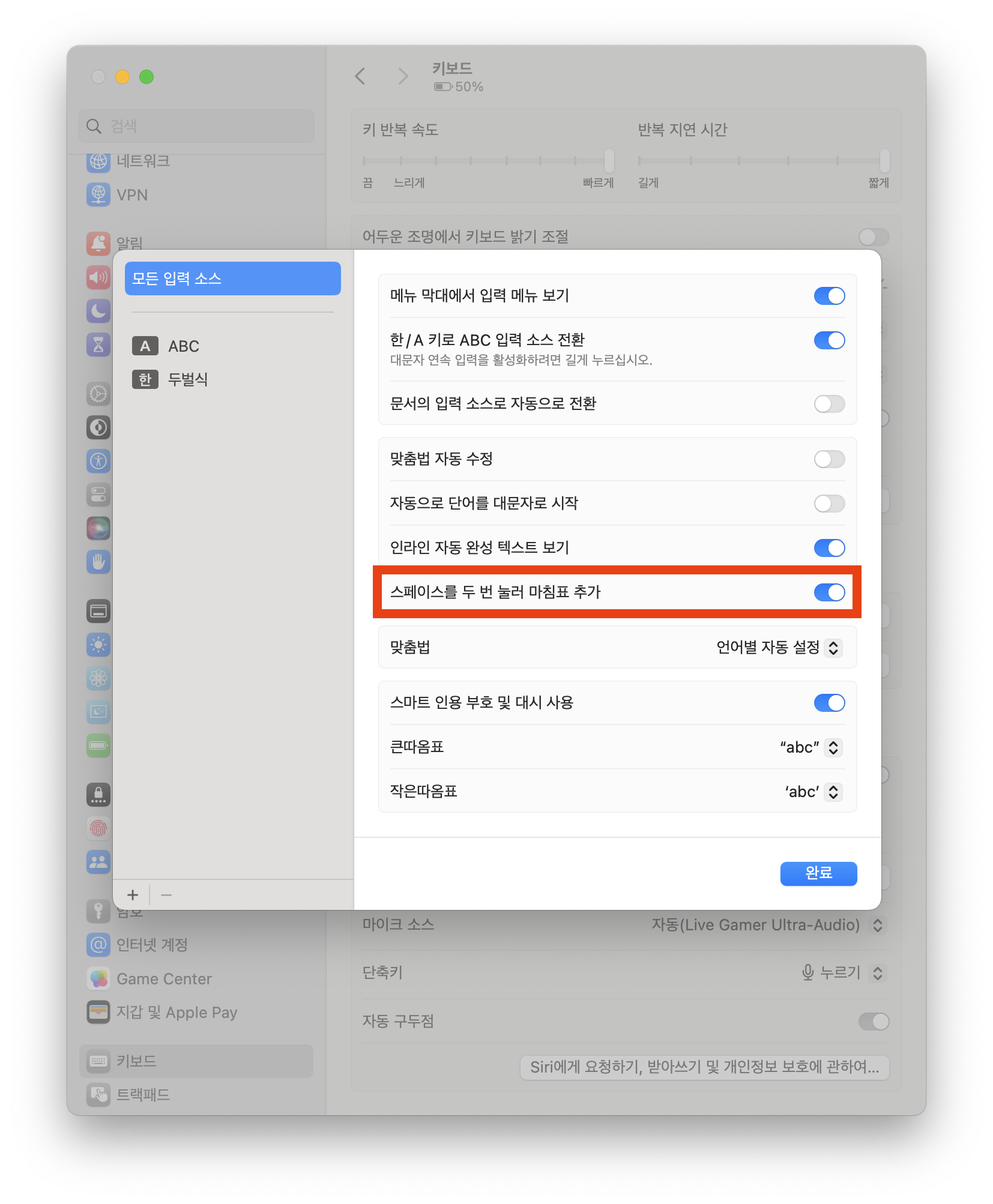 당연한 이야기지만 스페이스 두 번 눌러 마침표를 찍고자 한다면 설정으로 놓으면 된다