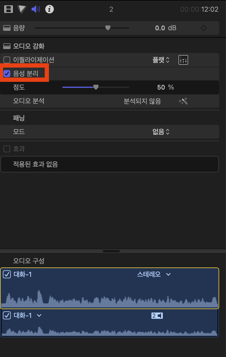 2. 우측 메뉴에서 오디오 옵션을 보면 음성분리 항목을 체크해준다