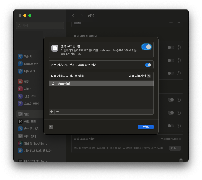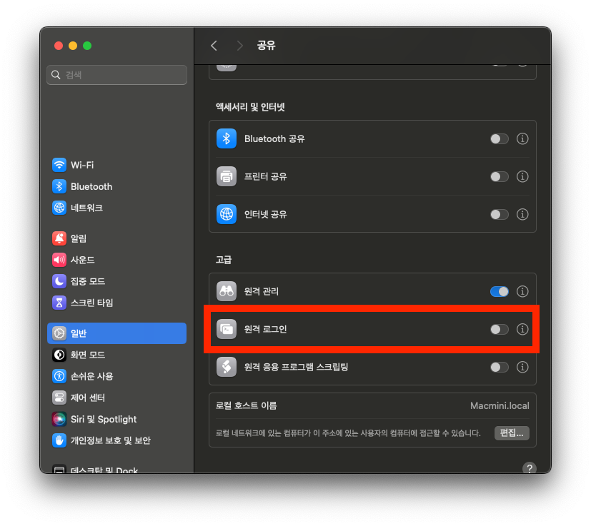 1. (맥미니) 원격로그인 설정설정 > 일반 > 공유에 들어가서 [원격 로그인]을 활성화 하자