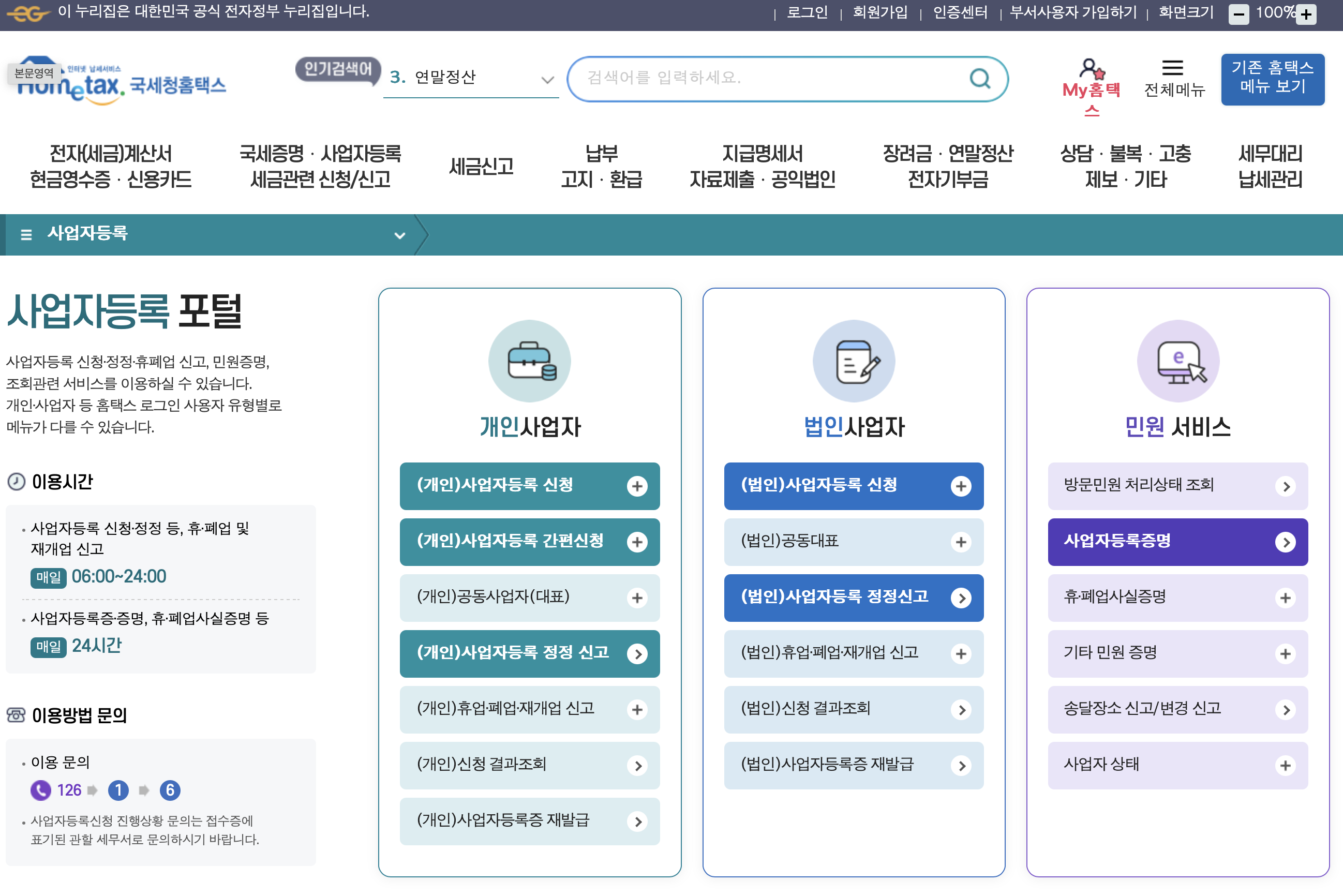 - '신청/제출' > '사업자등록신청/정정 등' > '사업자등록신청(개인)' 선택