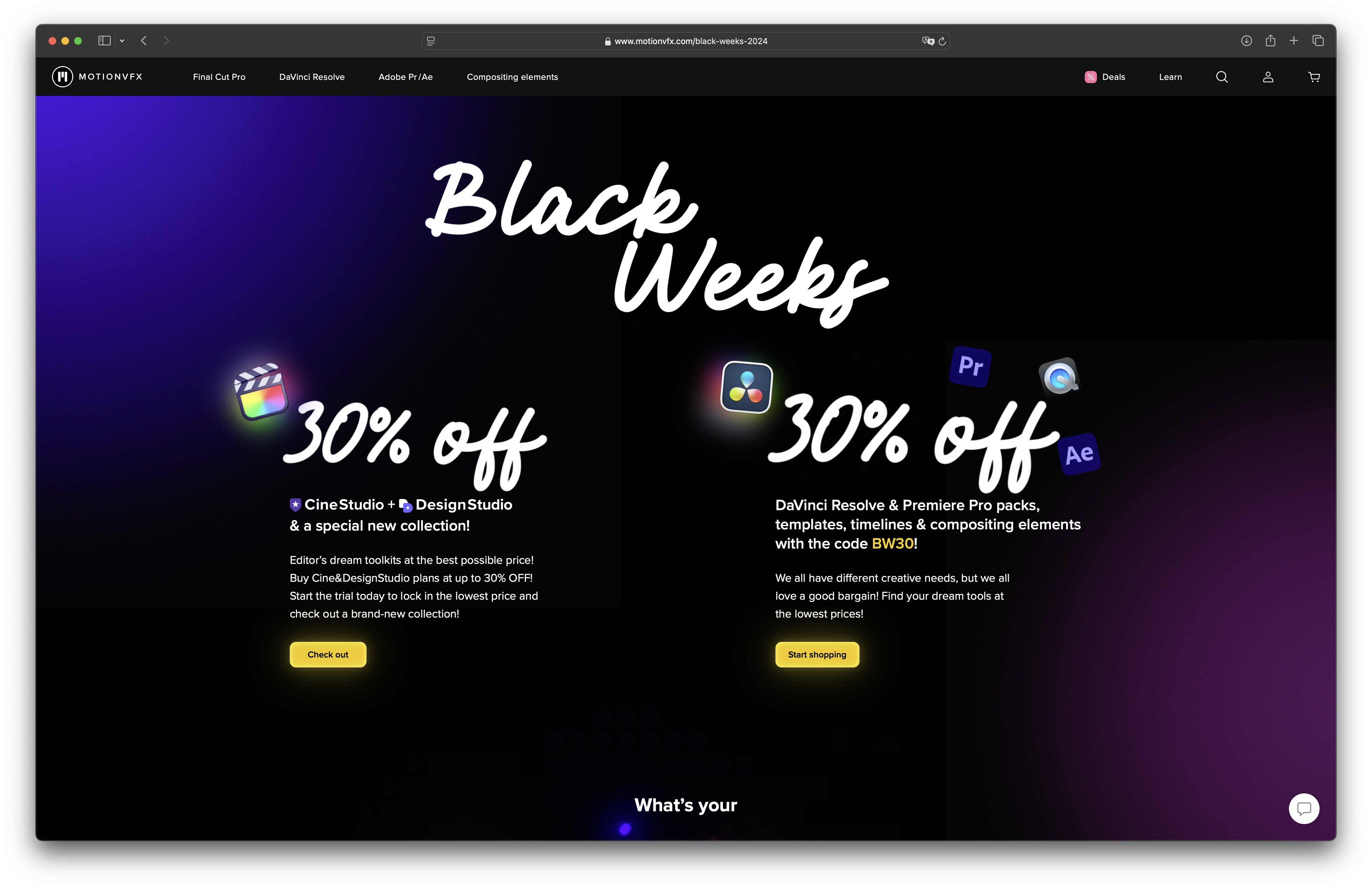 - MotionVFX 공식 홈페이지 방문 : MotionVFX 홈페이지에서 블랙프라이데이 특별 할인 페이지를 확인하세요.