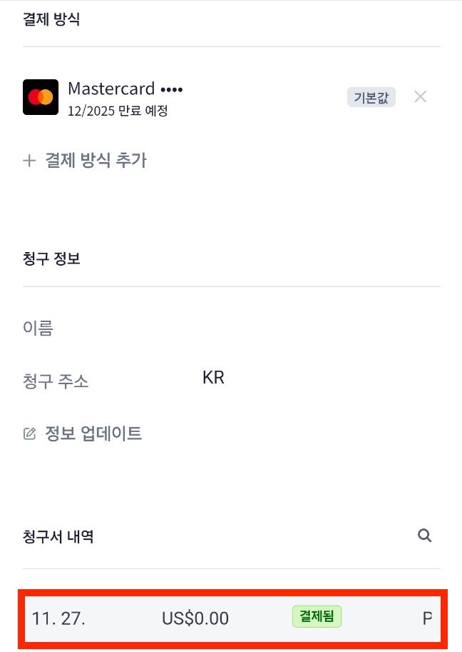 8. 계정의 [구독관리] 메뉴에서 구독 갱신일자와 청구서 내역을 확인해 보면 끝!
