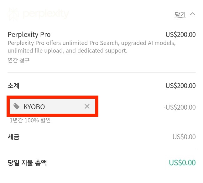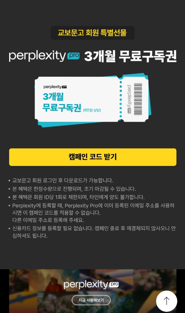 1. 교보문고 퍼플렉시티 프로 "캠페인 코드 받기"(교보문고 회원계정 필요)