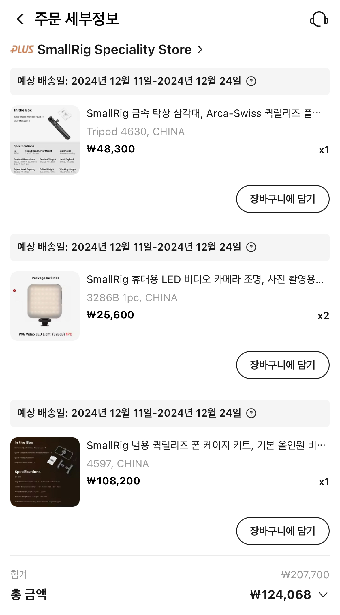 아래 구성상품을 각각 1개씩 구매했는데 조명은 2개 구입