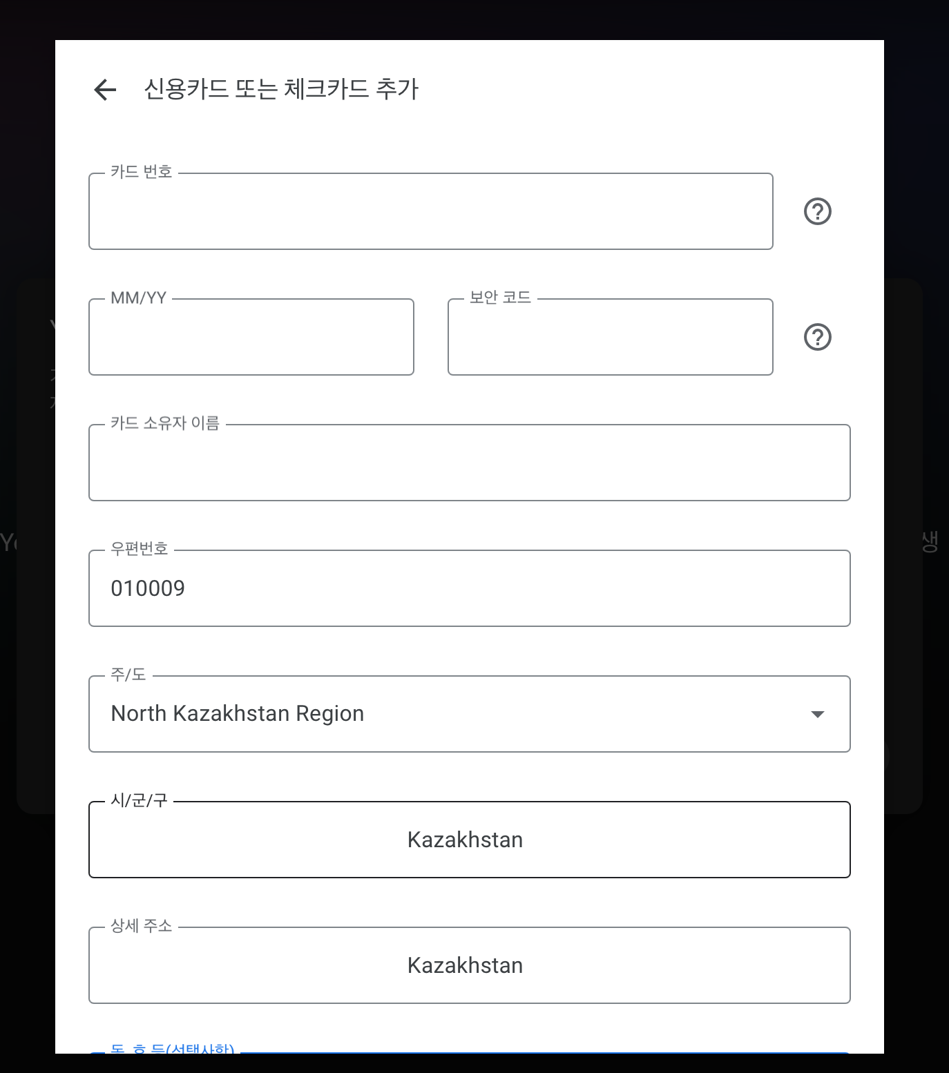카자흐스탄 우편번호는 010009를 적고 나머지 주소는 대충 적었다