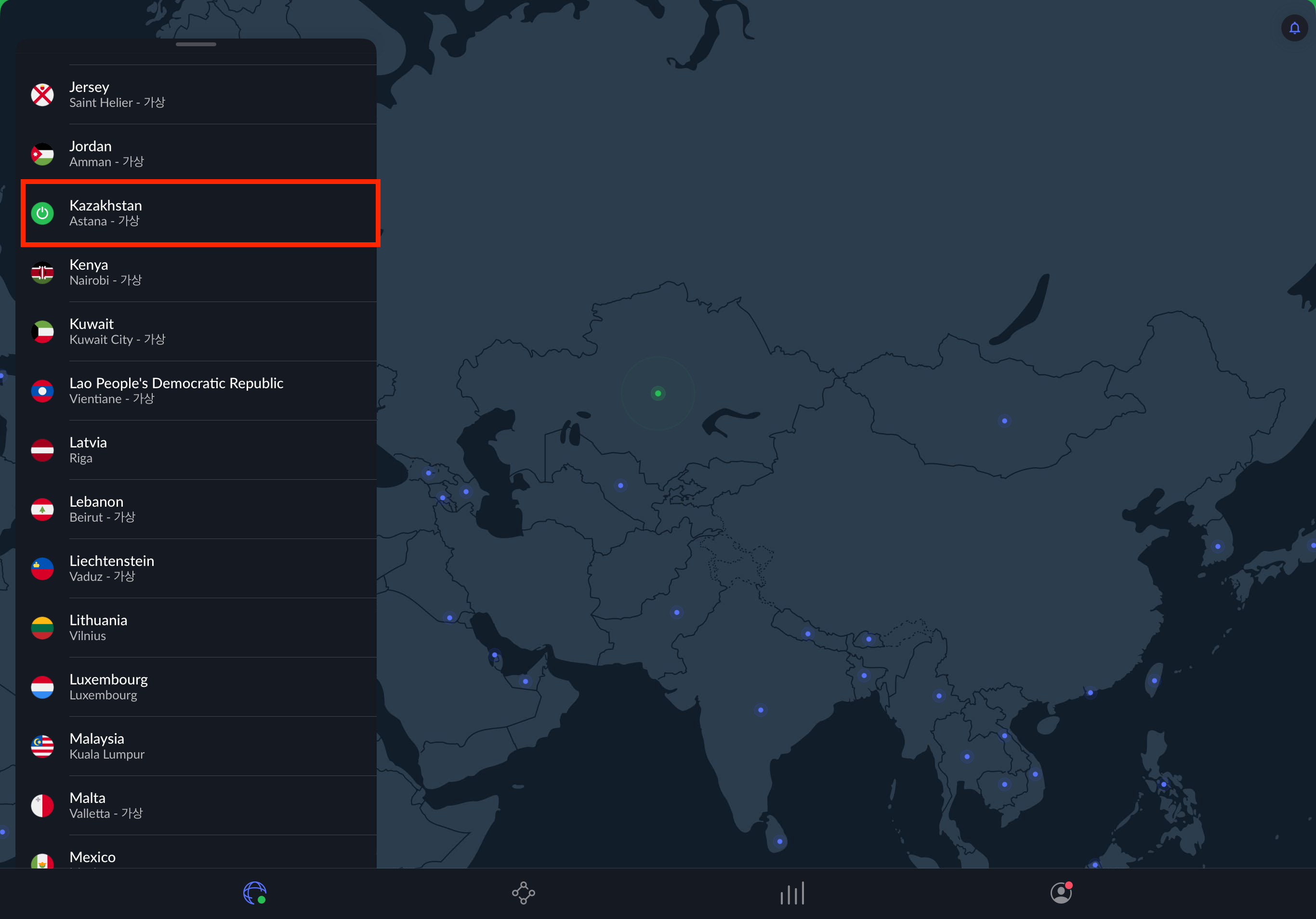 사전준비를 마쳤으면 노드VPN앱에서 카자흐스탄으로 접속하자
