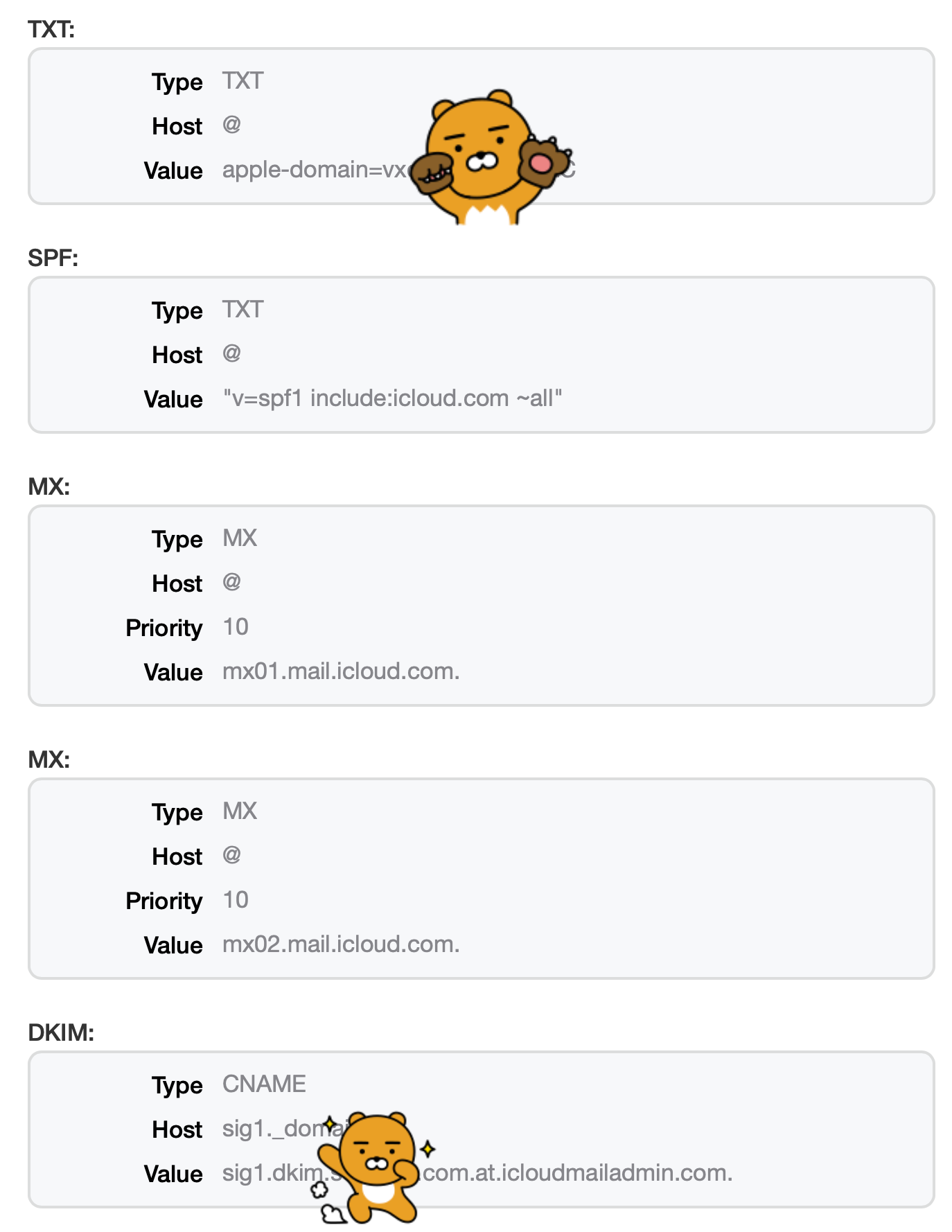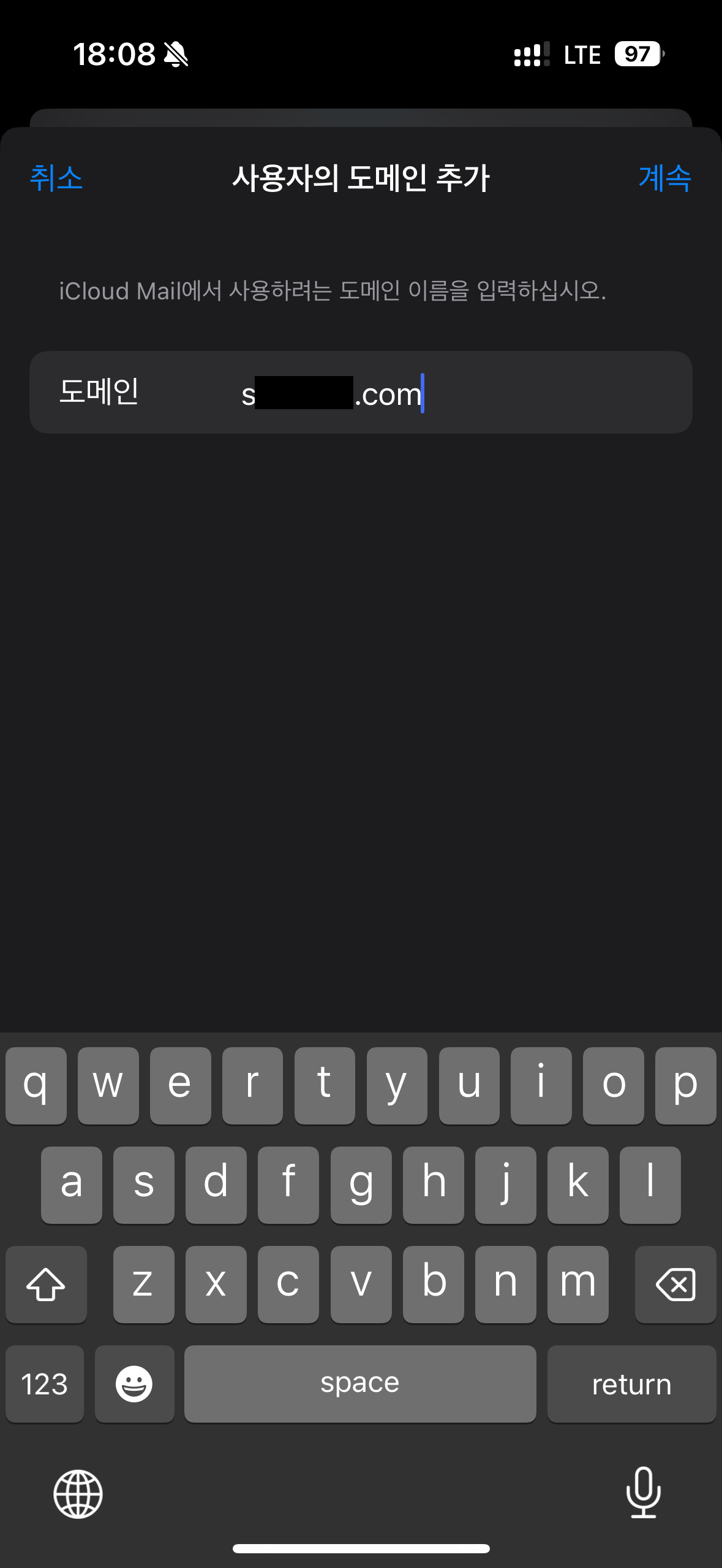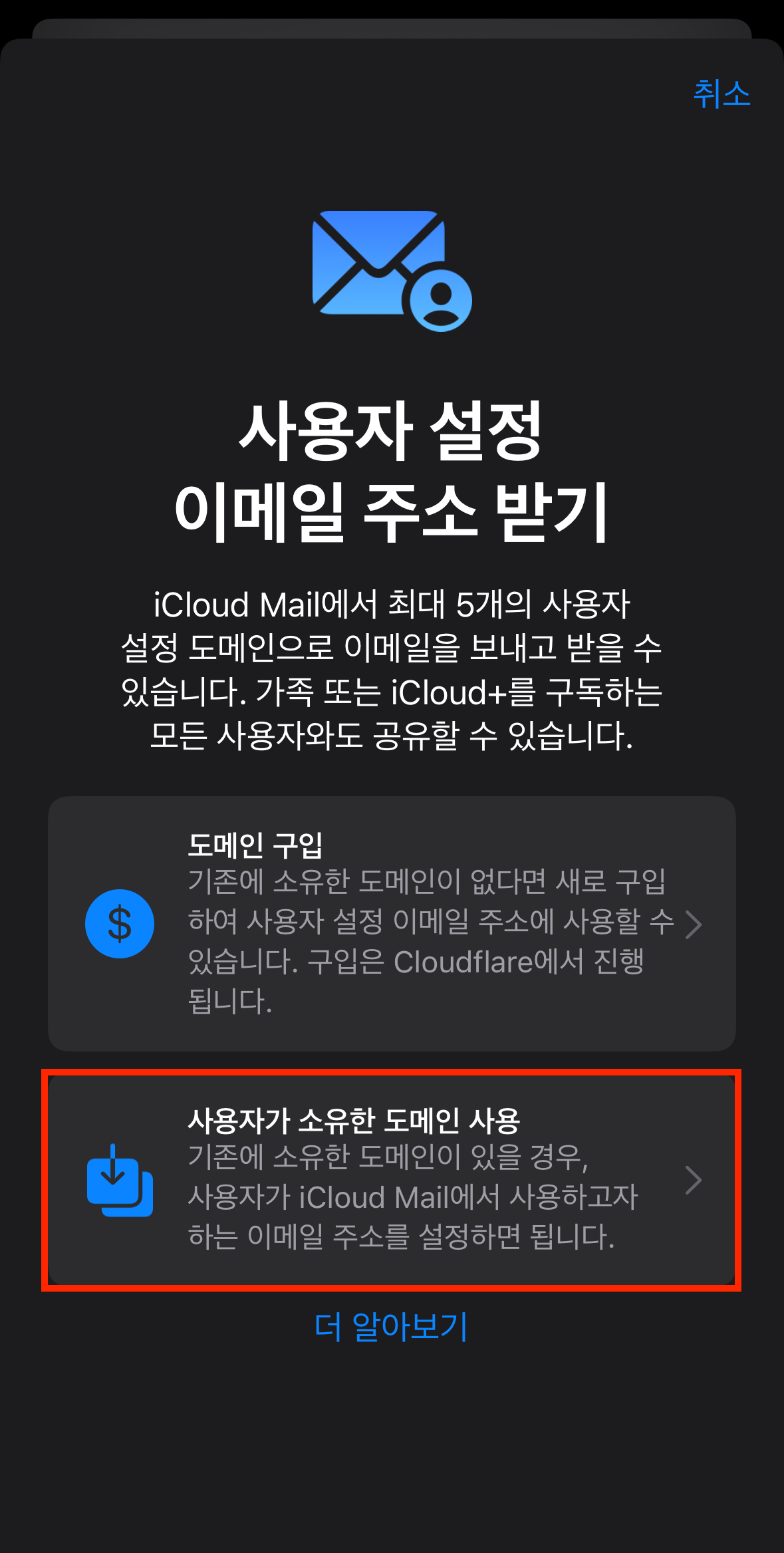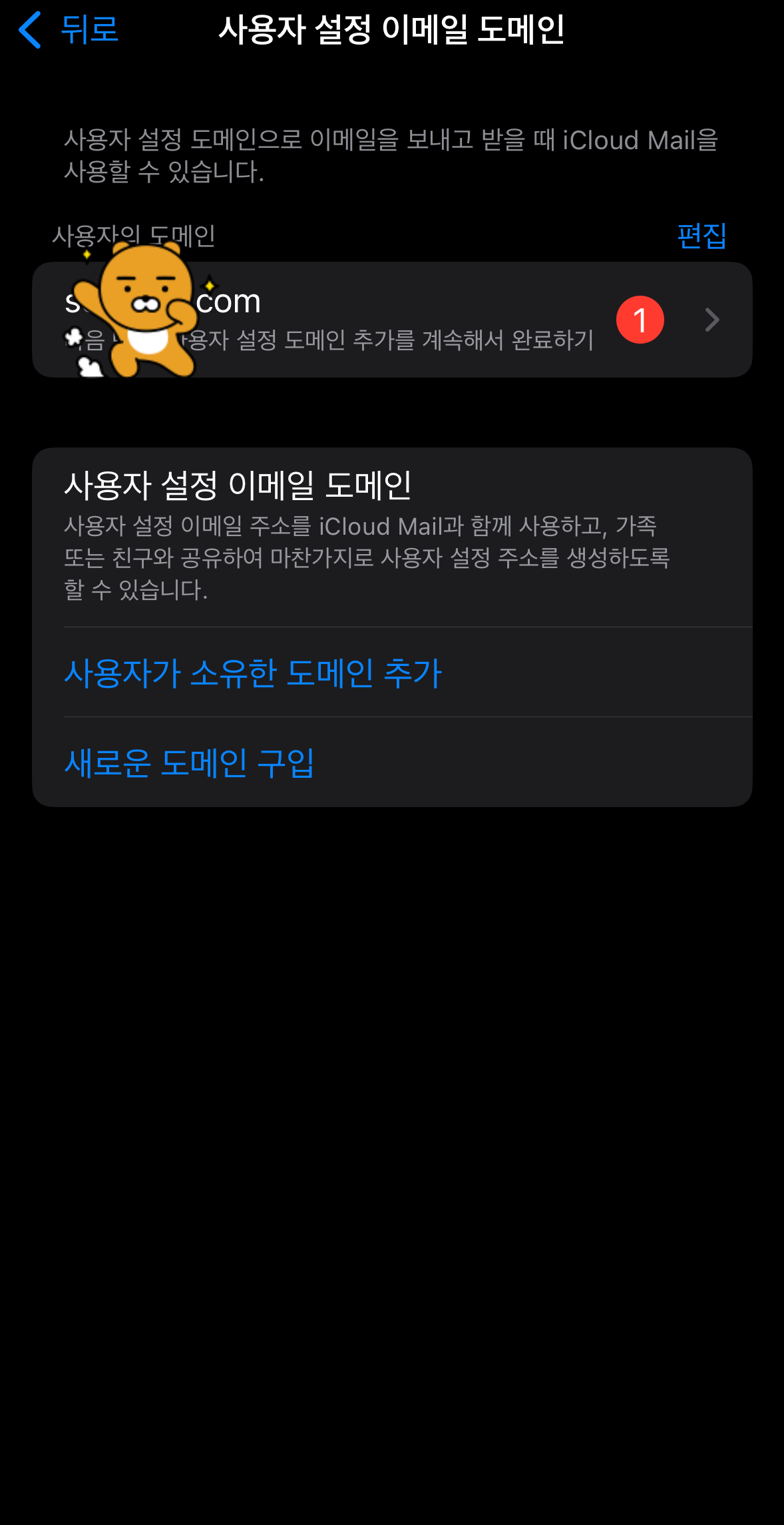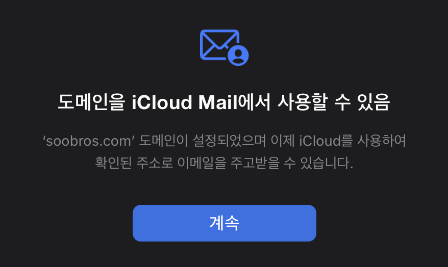 5분 정도 기다리니까 "도메인을 iCloud Mail에서 사용할 수 있음" 메시지를 확인할 수 있었다