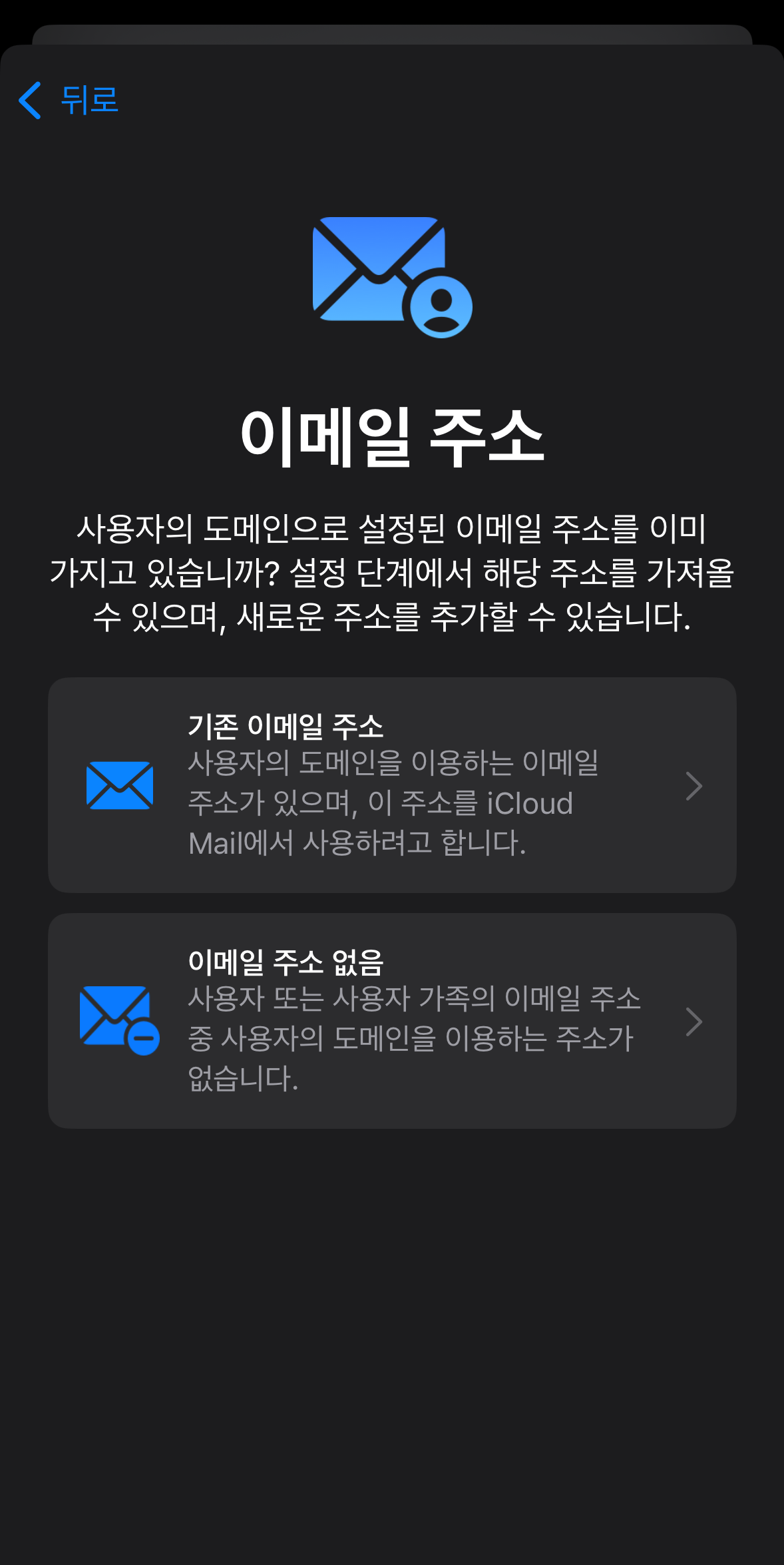 4. 타사이트에서 아이클라우드로 옮기는 경우기 때문에 나는 기존 이메일 주소를 선택했다. 처음 시도하는 사람이라면 이메일 주소 없음 선택
