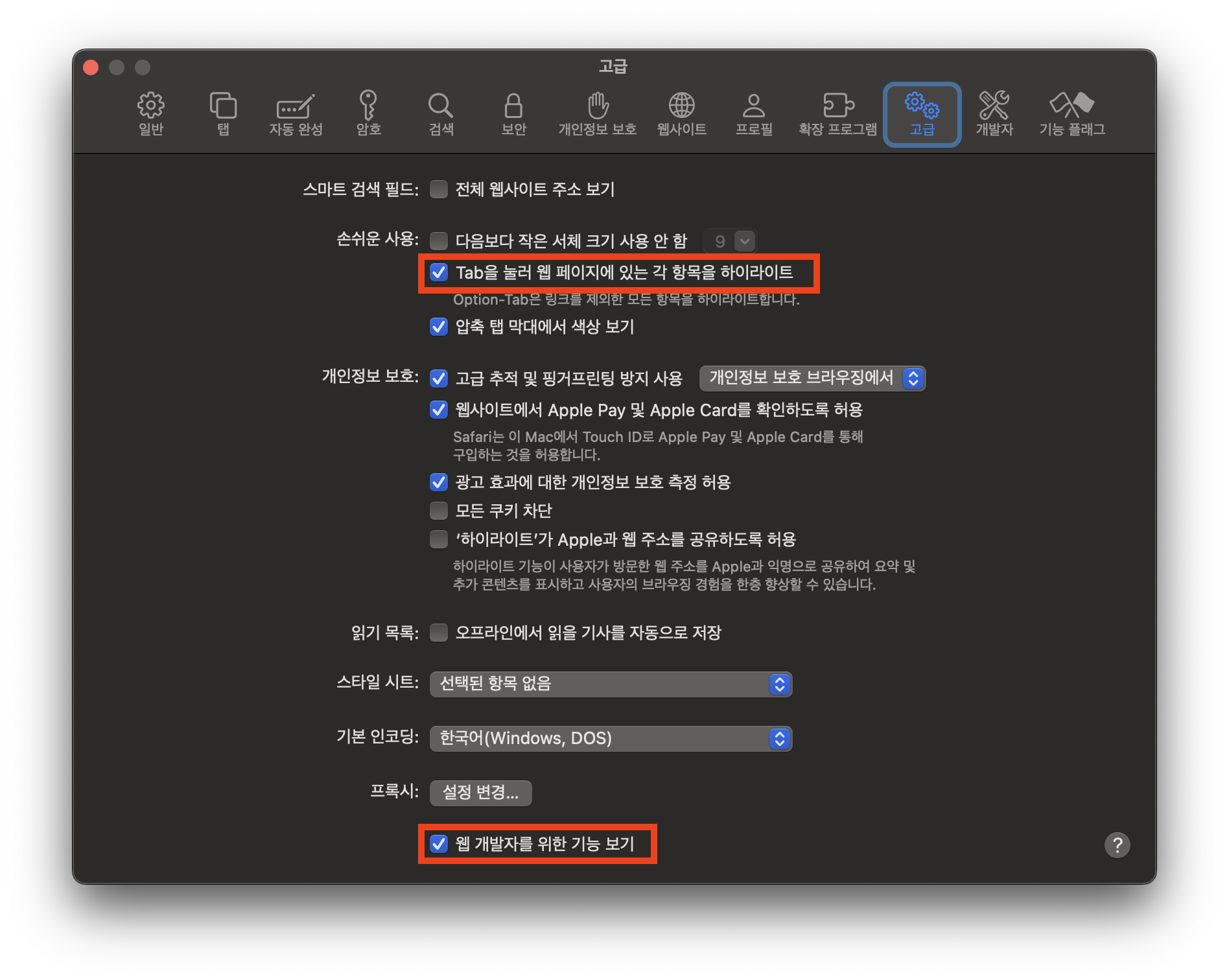 추가적으로 탭키로 각 항목을 탐색이동할 수 있는 [Tab을 눌러 웹 페이지에 있는 각 항목을 하이라이트] 항목도 함께 설정해주자