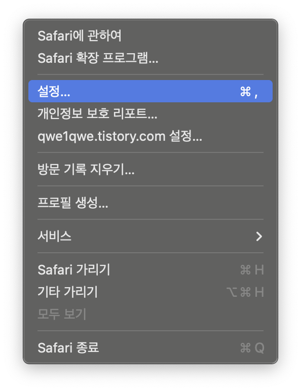 맥의 인터넷브라우저인 사파리를 열고 [사파리 > 설정] 으로 이동