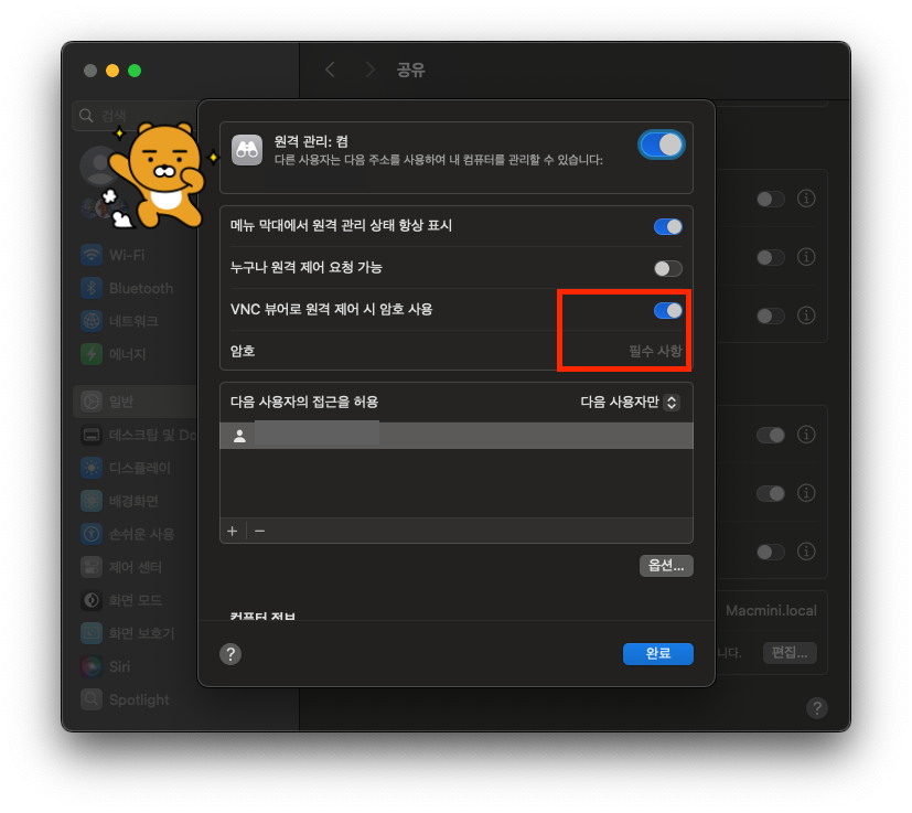 - [설정 > 일반 > 공유] 원격 관리 옆에 있는 버튼을 누르고, VNC 뷰어로 원격 제어 시 암호 사용을 설정하고 아래에 보안을 위해 비번 설정