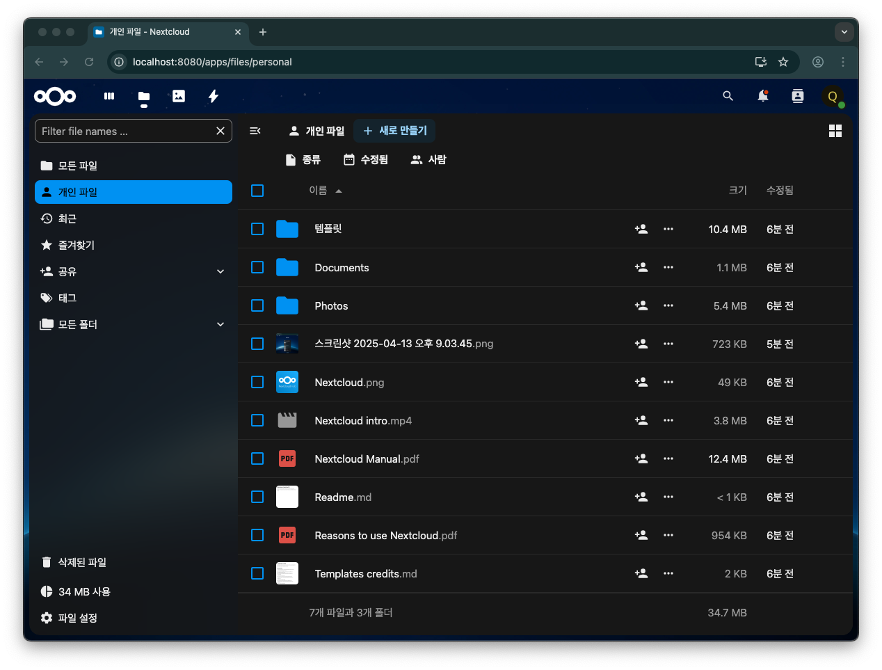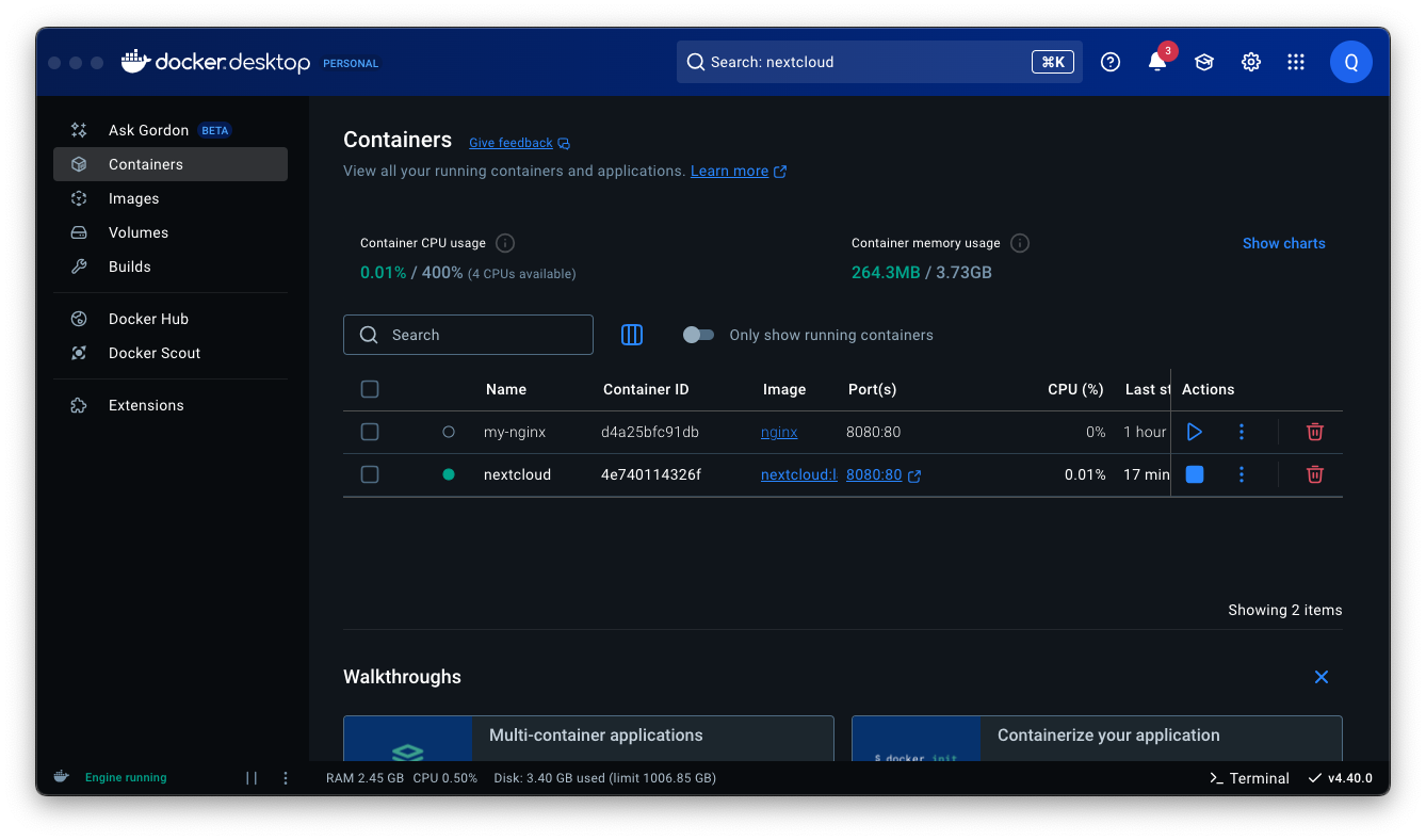 Containers에 보면 nextcloud가 잘 떠있는 것을 볼 수 있다