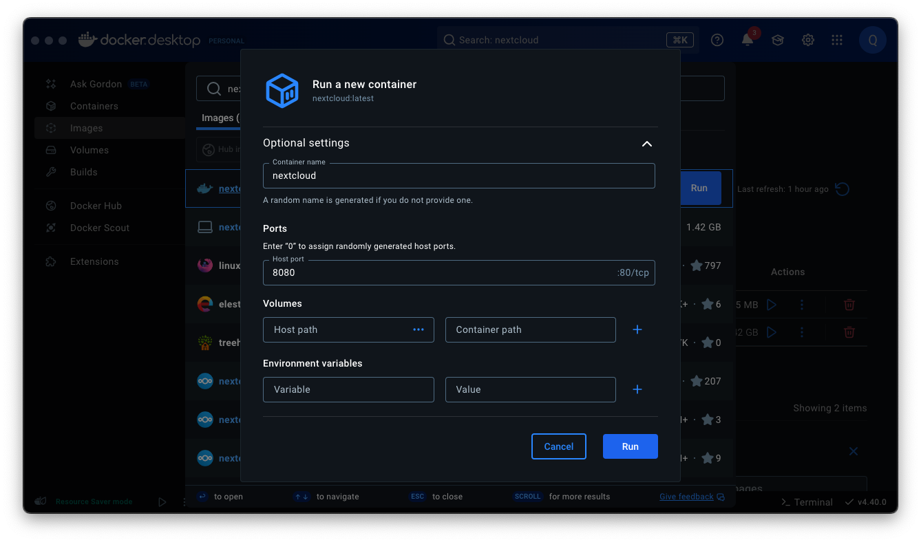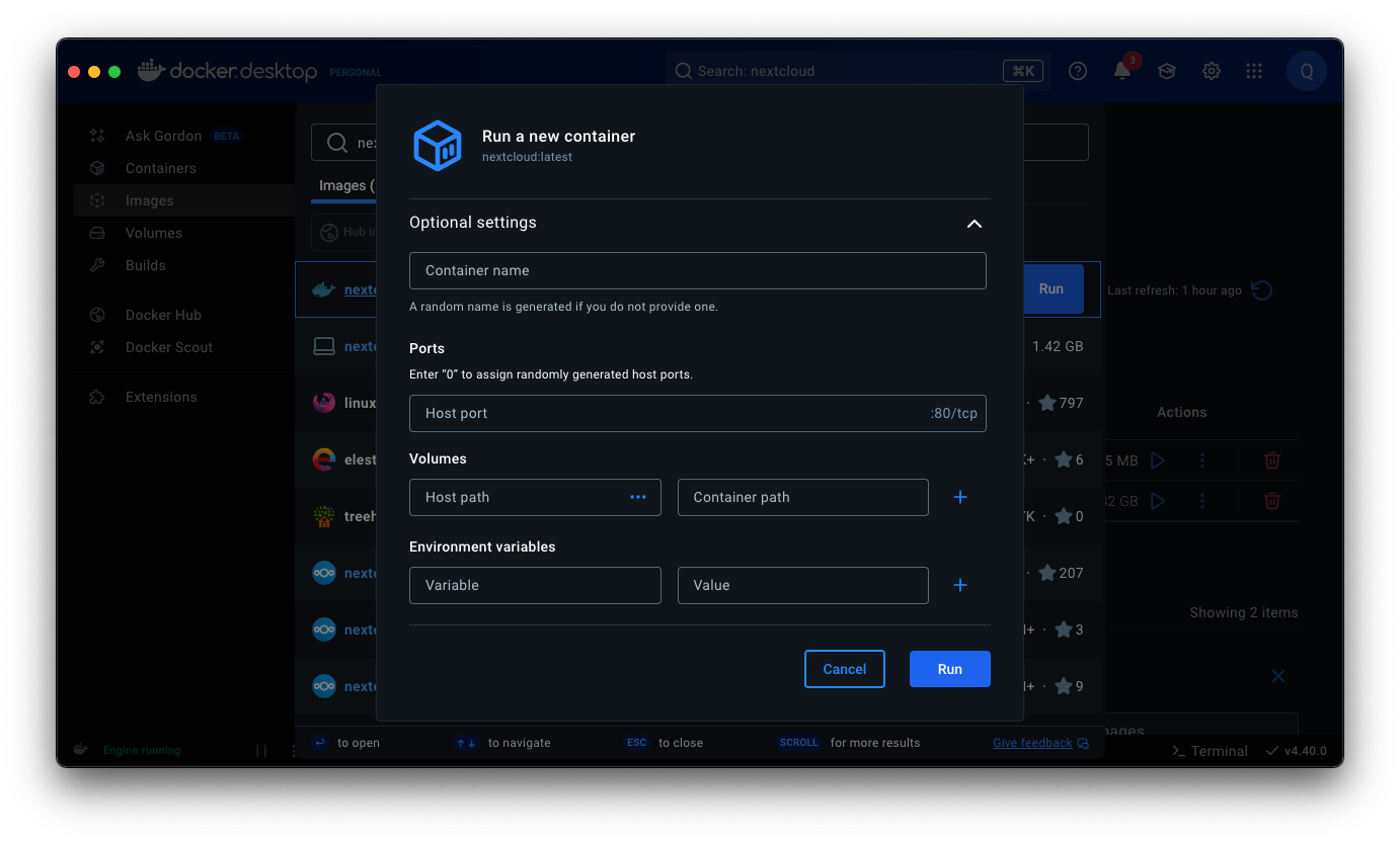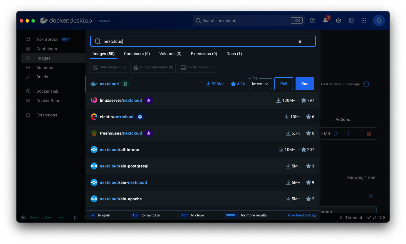 도커 데스크탑 > 상단 검색창 Search > nextcloud 입력