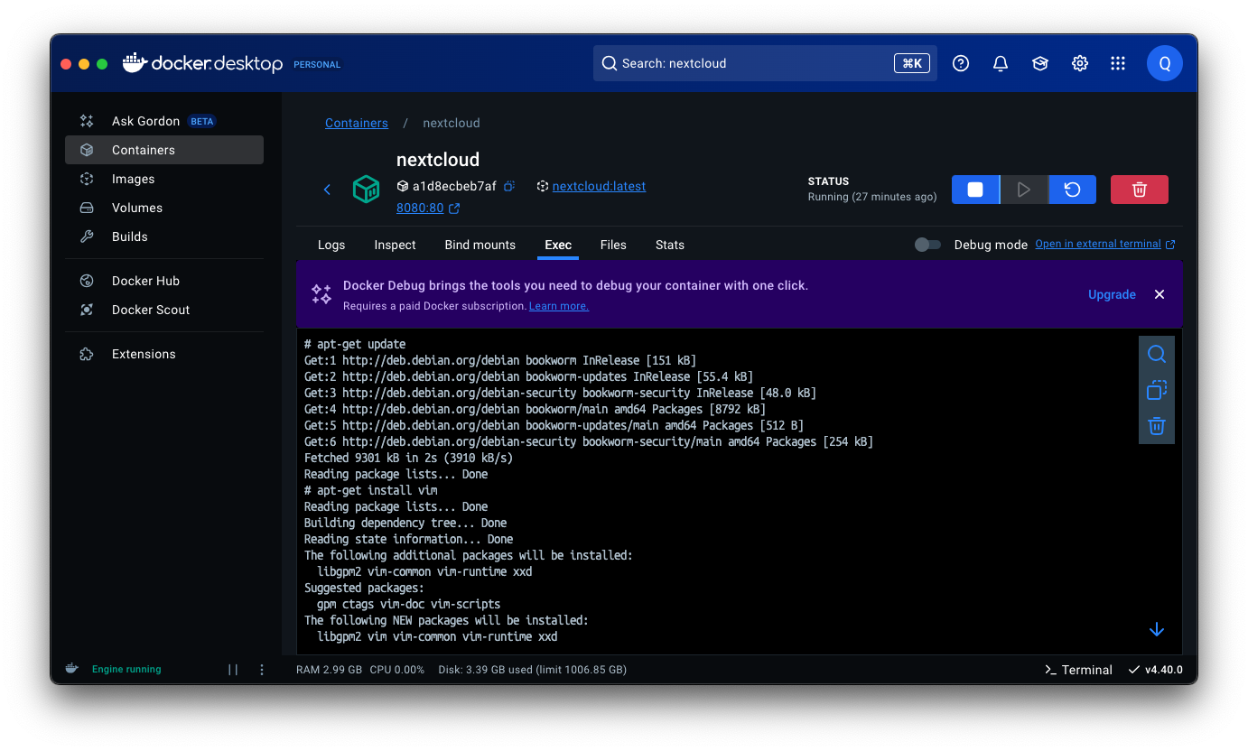 Containers > nextcloud > Exec에 들어가 보면 명령어를 입력할 수 있는데