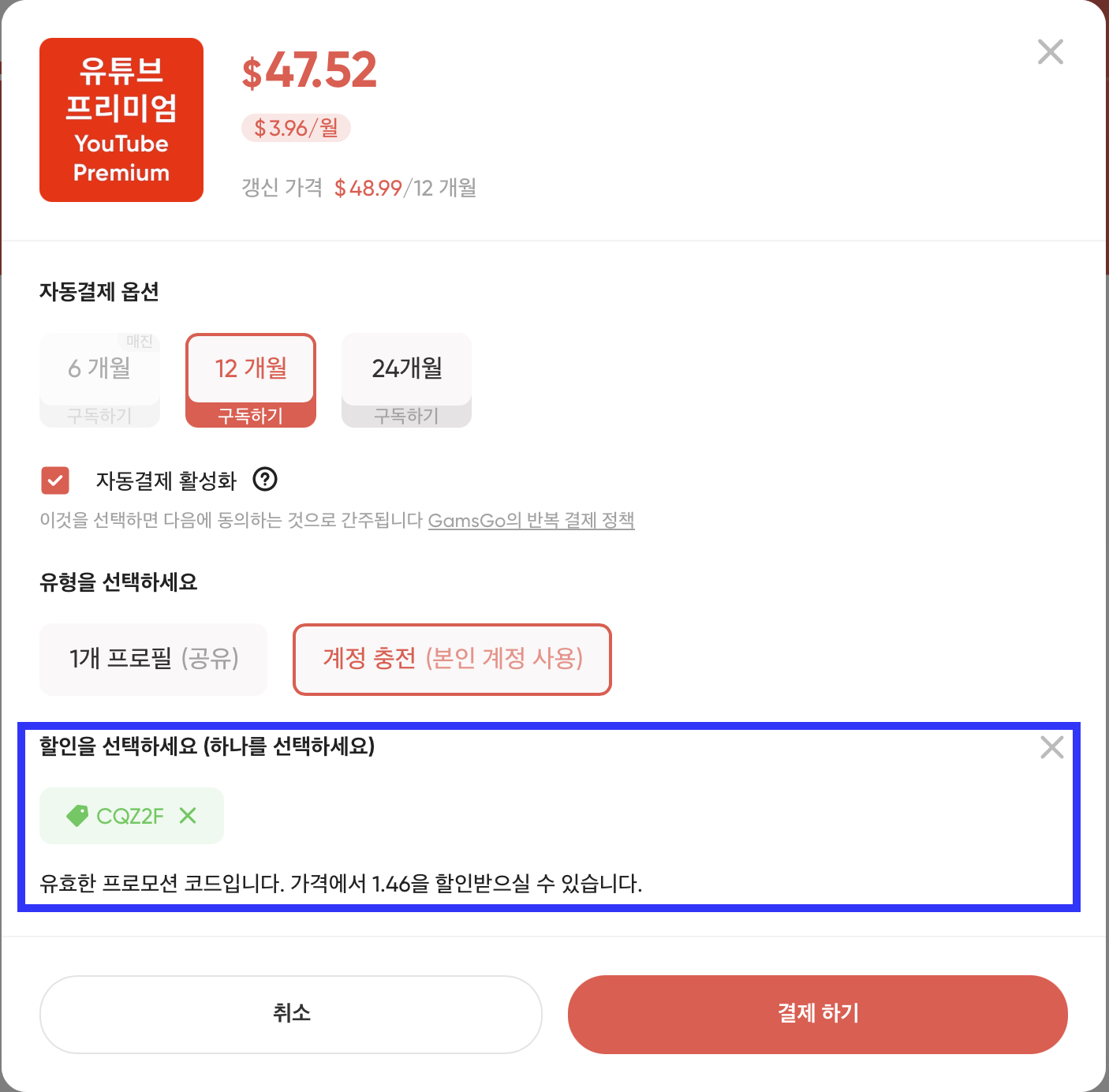 12개월 결제 그리고 계정 충전(본인 계정 사용)을 선택했다